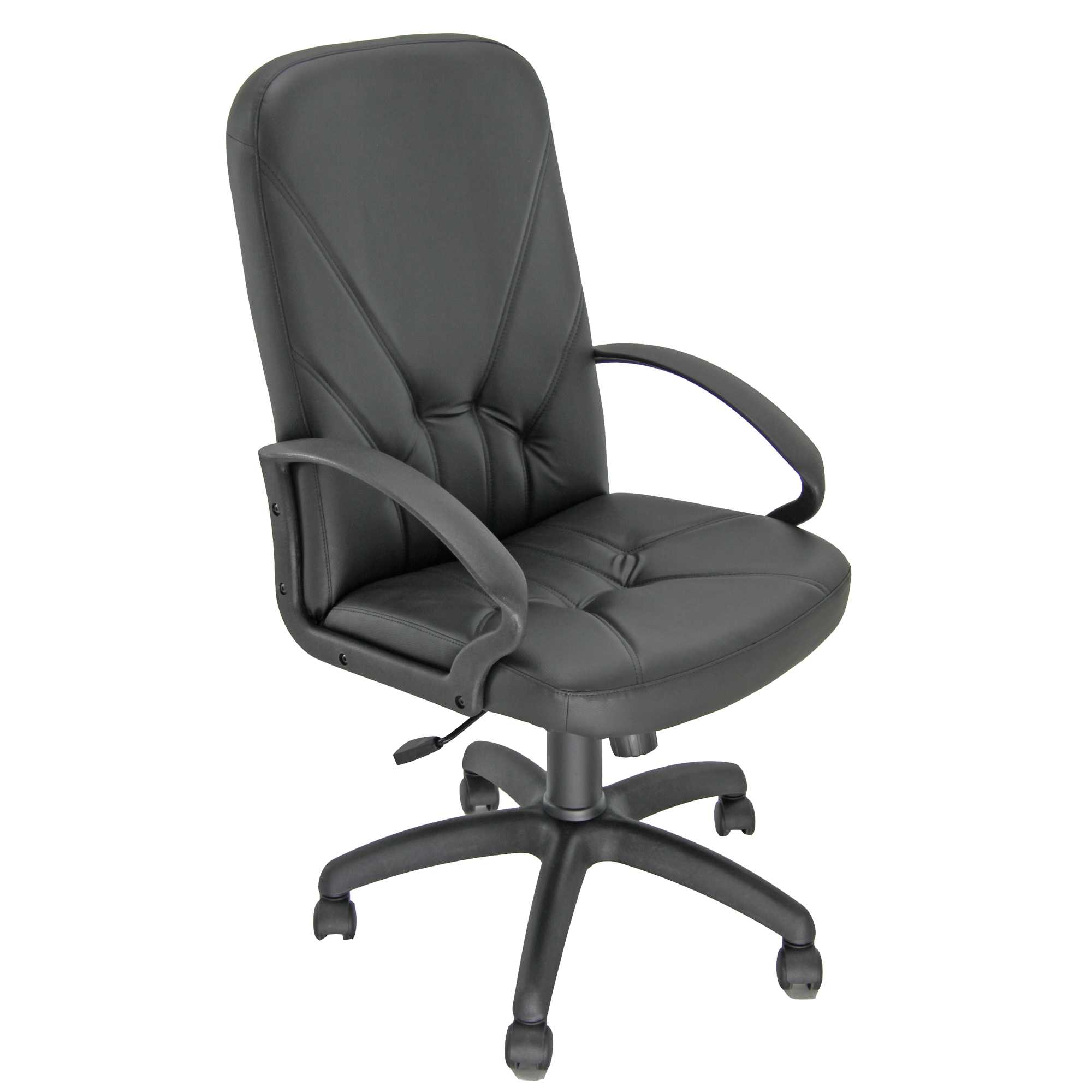 POLTRONA IN SIMILPELLE COLORE NERO CON SCHIENALE ALTO. BRACCIOLI E BASE CON RUOTE IN NYLON. MECCANISMO OSCILLANTE CON BLOCCHI. SCHIENALE FISSO. ELEVAZIONE A GAS.