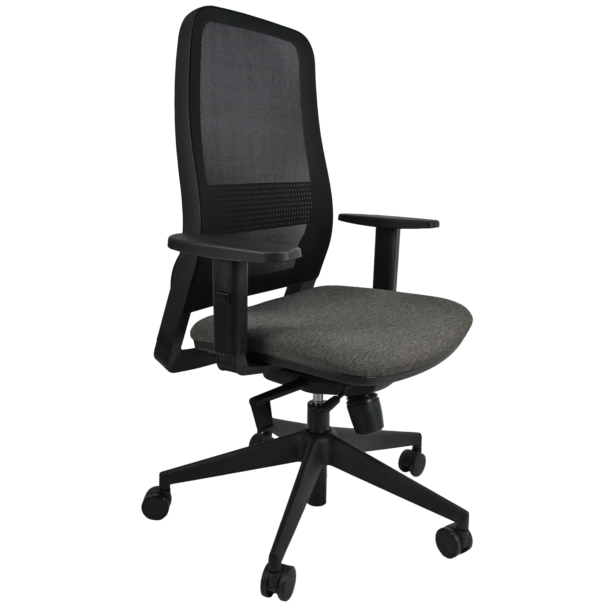 SEDUTA GIREVOLE SU RUOTE OPERATIVA, CON SCHIENALE IN RETE, ELEVAZIONE A GAS E SUPPORTO LOMBARE REGOLABILE MECCANISMO SYNCHRO CON ANTI SHOCK - SCHIENALE REGOLABILE IN ALTEZZA. BRACCIOLI INCLUSI.