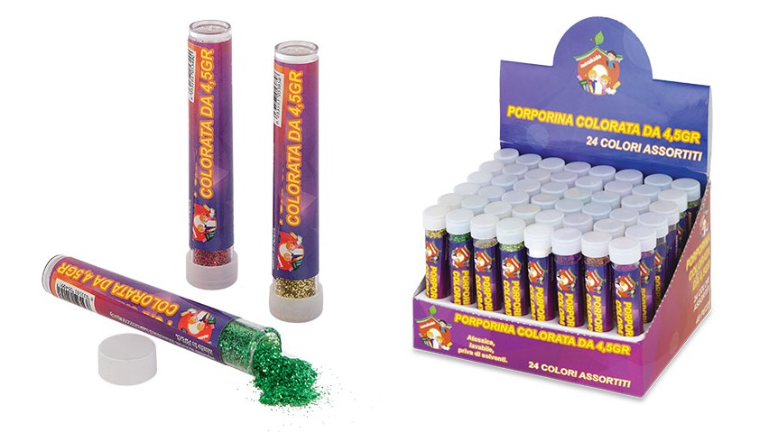 Porporina da 4,5 gr. In espositore da 48 pezzi. In 2 pezzi per colore. 24 colori.