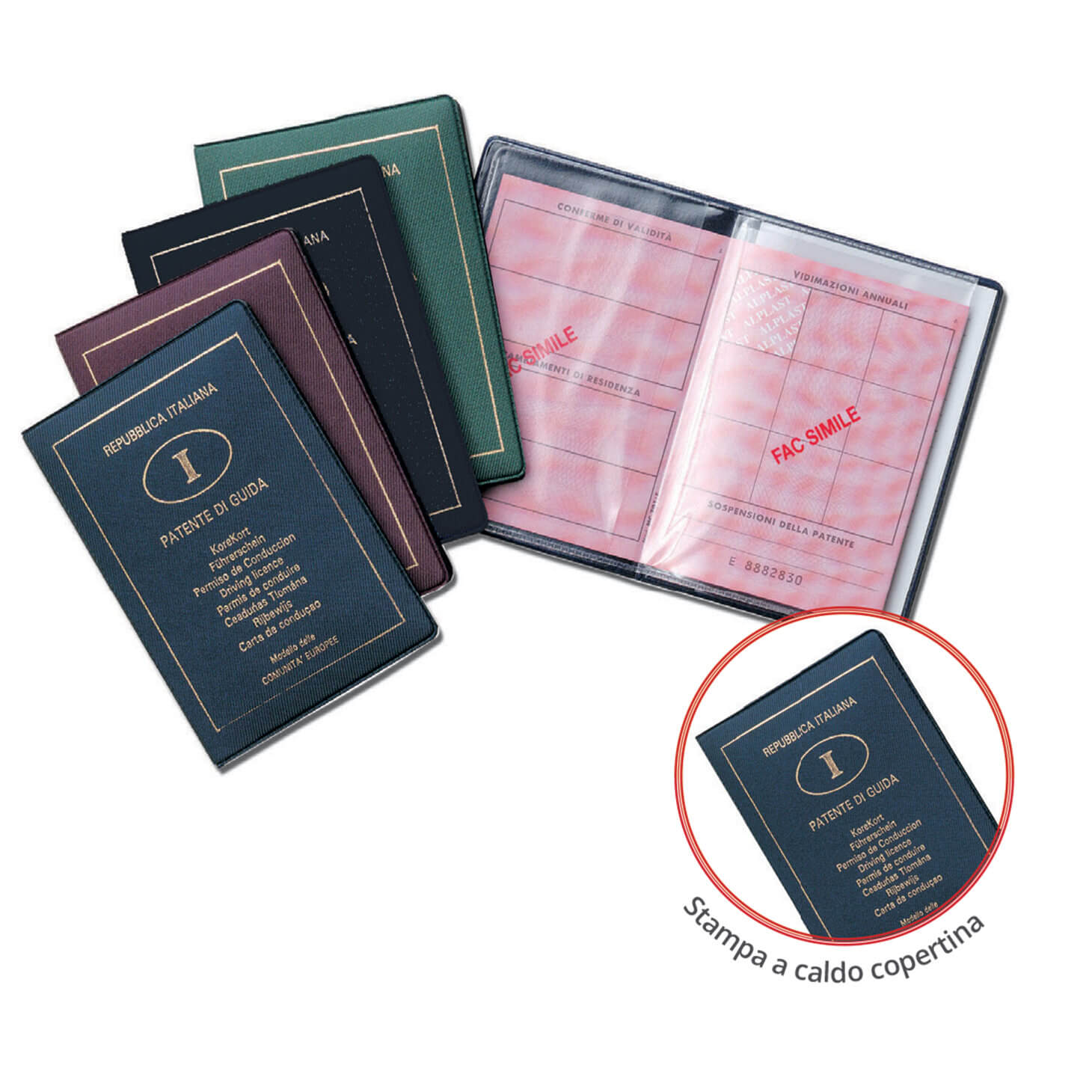 Copertina in pvc espanso sergè spessore 1,2 mm con custodia interna per la patente in pvc cristal e biglietto generalità. Stampa a caldo.