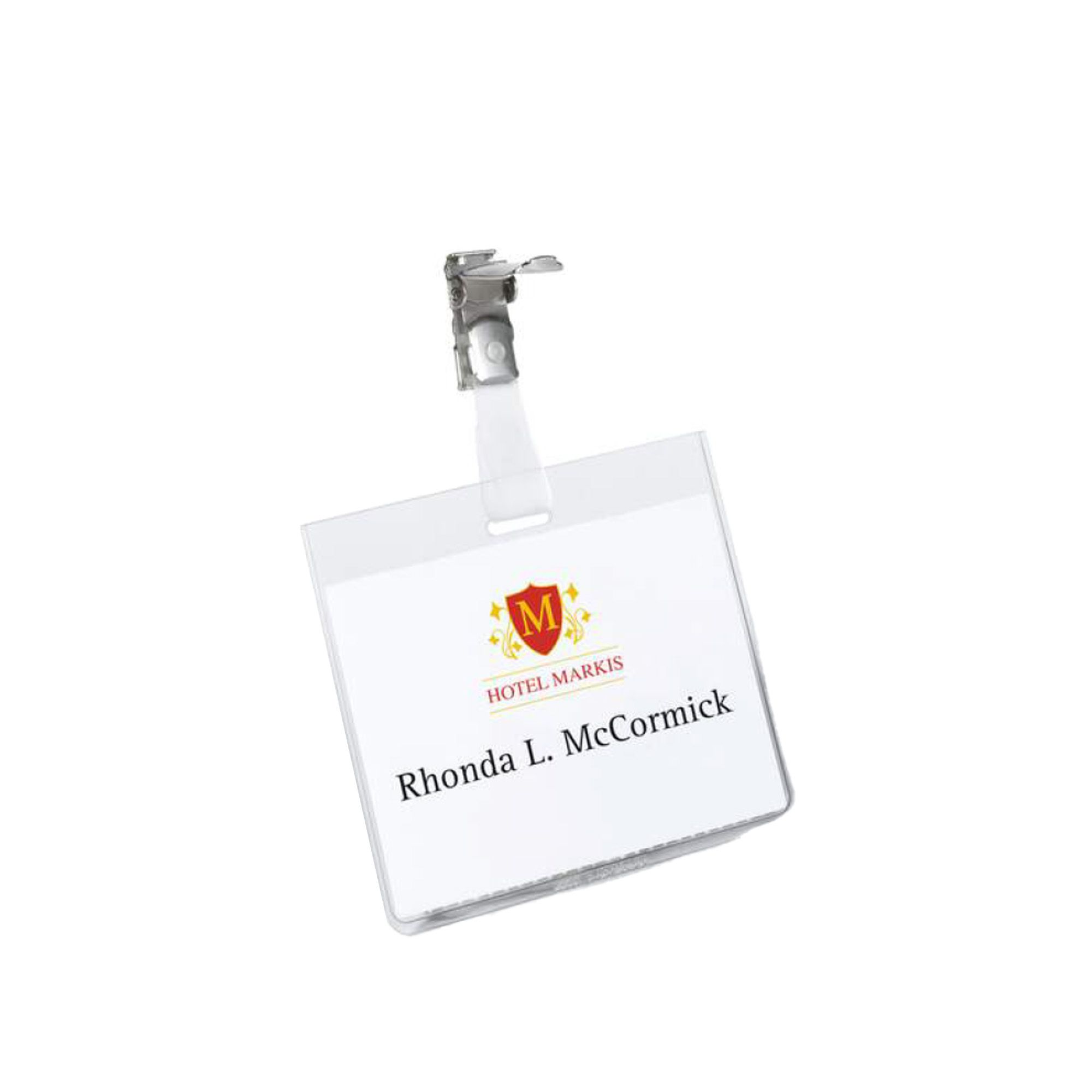 PORTABADGE IN PVC TRASPARENTE CON CLIP IN METALLO SALVATESSUTO- CARTONCINO INSERTO BIANCO. FORMATO 60X90MM ORIZZONTALE.