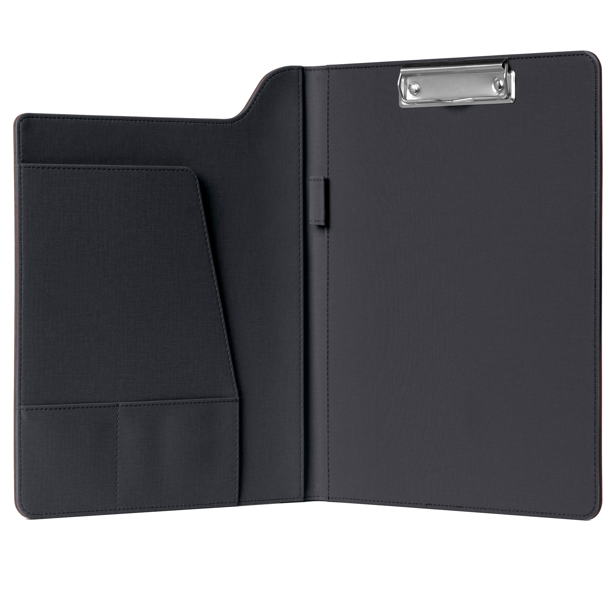 Cartella portablocco dotata di molla in metallo per blocchi A4. Copertina frontale antiscivolo. Dotata di aletta portadocumenti, scomparto per biglietti e asola portapenne.