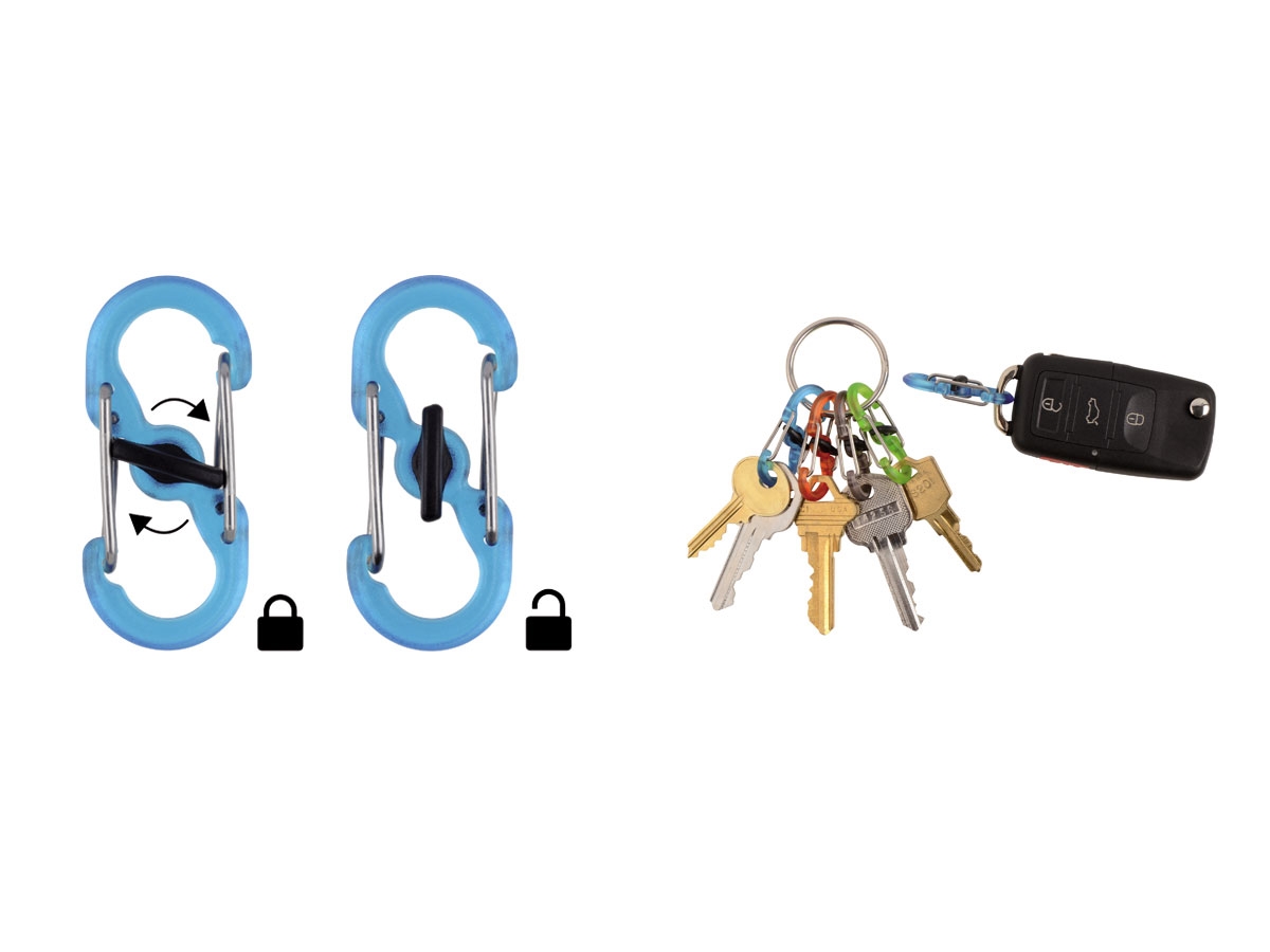 Il Keyring Locker S-Biner presenta un solido anello in acciaio inossidabile da 1 pollice abbinato a cinque S-Biner Microlock in plastica colorata che proteggono, trattengono e identificano le tue chiavi. Gli innovativi MicroLock possono contenere fino a tre chiavi ciascuno e si bloccano e si sbloccano con una rotazione, rendendo l'inserimento e il distacco facile e sicuro.