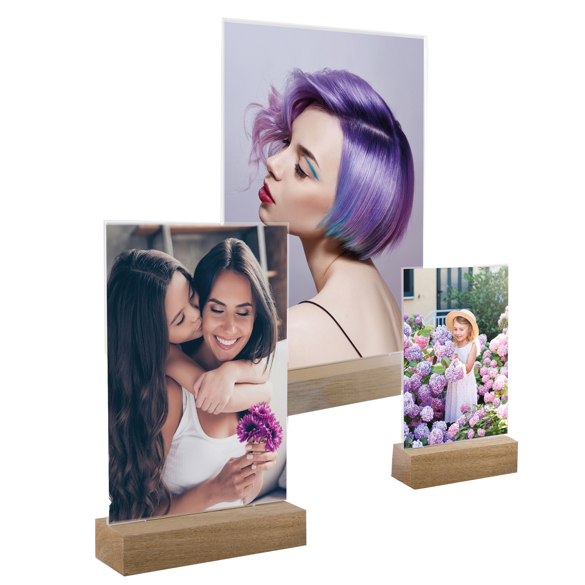 PORTADEPLIANT VERTICALE IN ACRILICO DI ALTA QUALITA' SUPER TRASPARENTE, CON BASE IN LEGNO MASSELLO, IDEALE ANCHE COME PORTAFOTO.