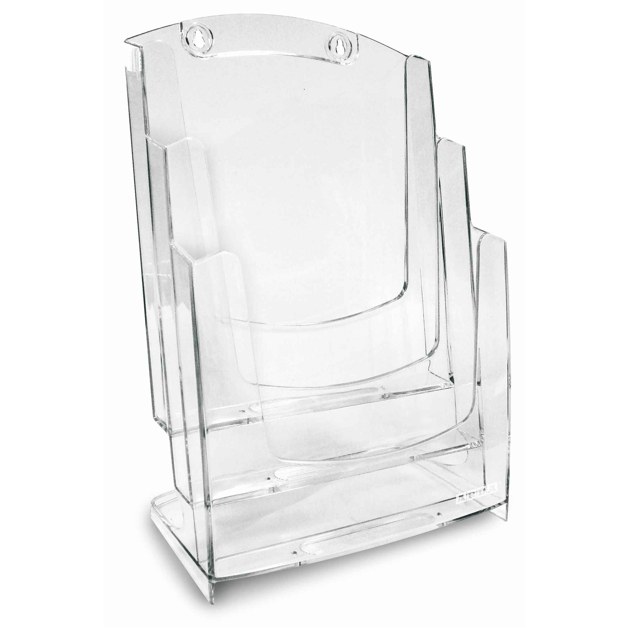 PORTADEPLIANT DA PARETE E DA BANCO A TASCA MULTIPLA (3 TASCHE F.TO A4). DESIGN PULITO ED ESSENZIALE, IN MATERIALE PLASTICO PERFETTAMENTE TRASPARENTE CON DORSO LEGGERMENTE INCLINATO PER GARANTIRE LA MASSIMA STABILITA' DEL MATERIALE ESPOSTO. DIMENSIONE 23,7X35,7X18,2CM.