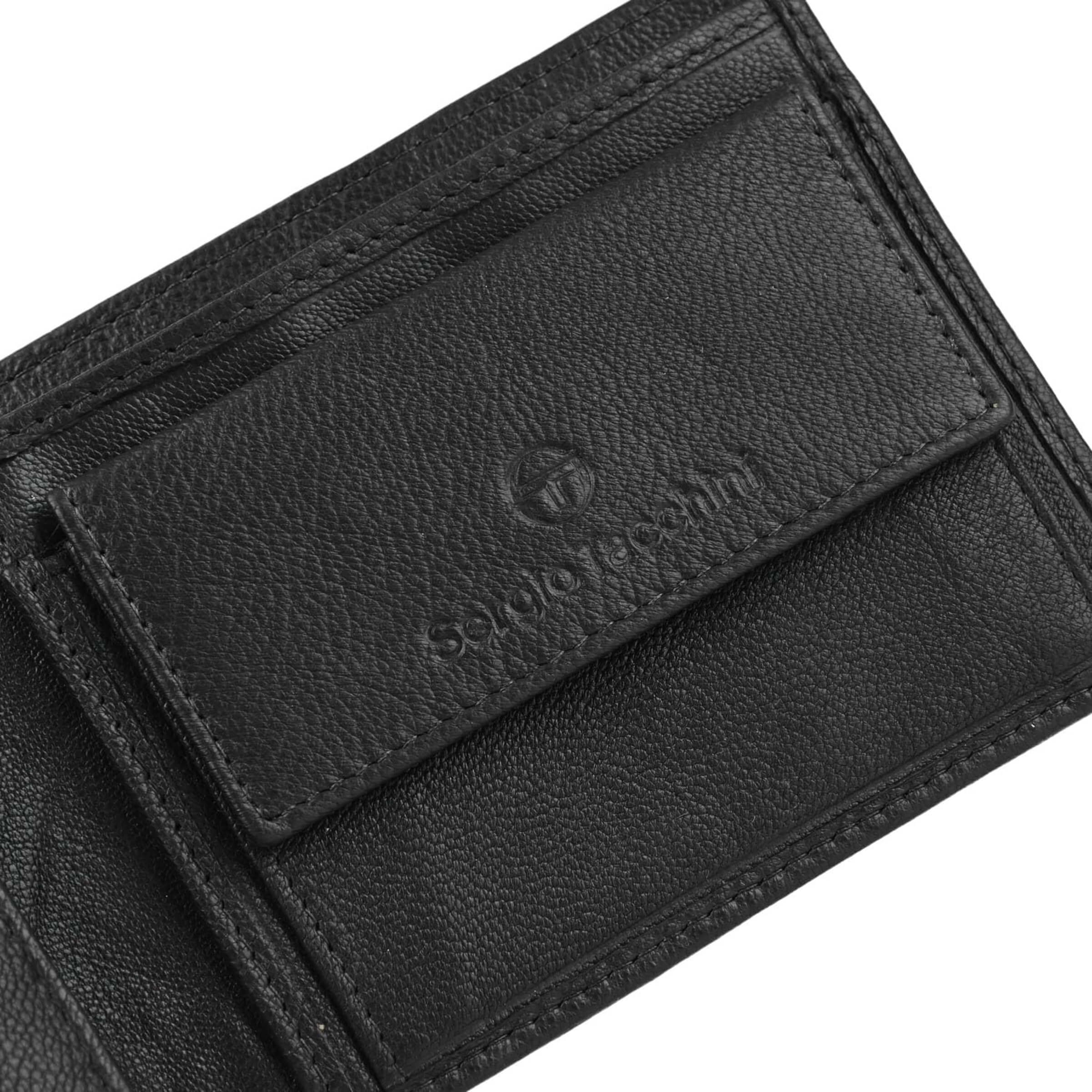 • Tasca portamonete con chiusura: una soluzione discreta ma sicura per custodire monete o piccoli oggetti, integrata nel design senza compromettere la linea essenziale del portafoglio.