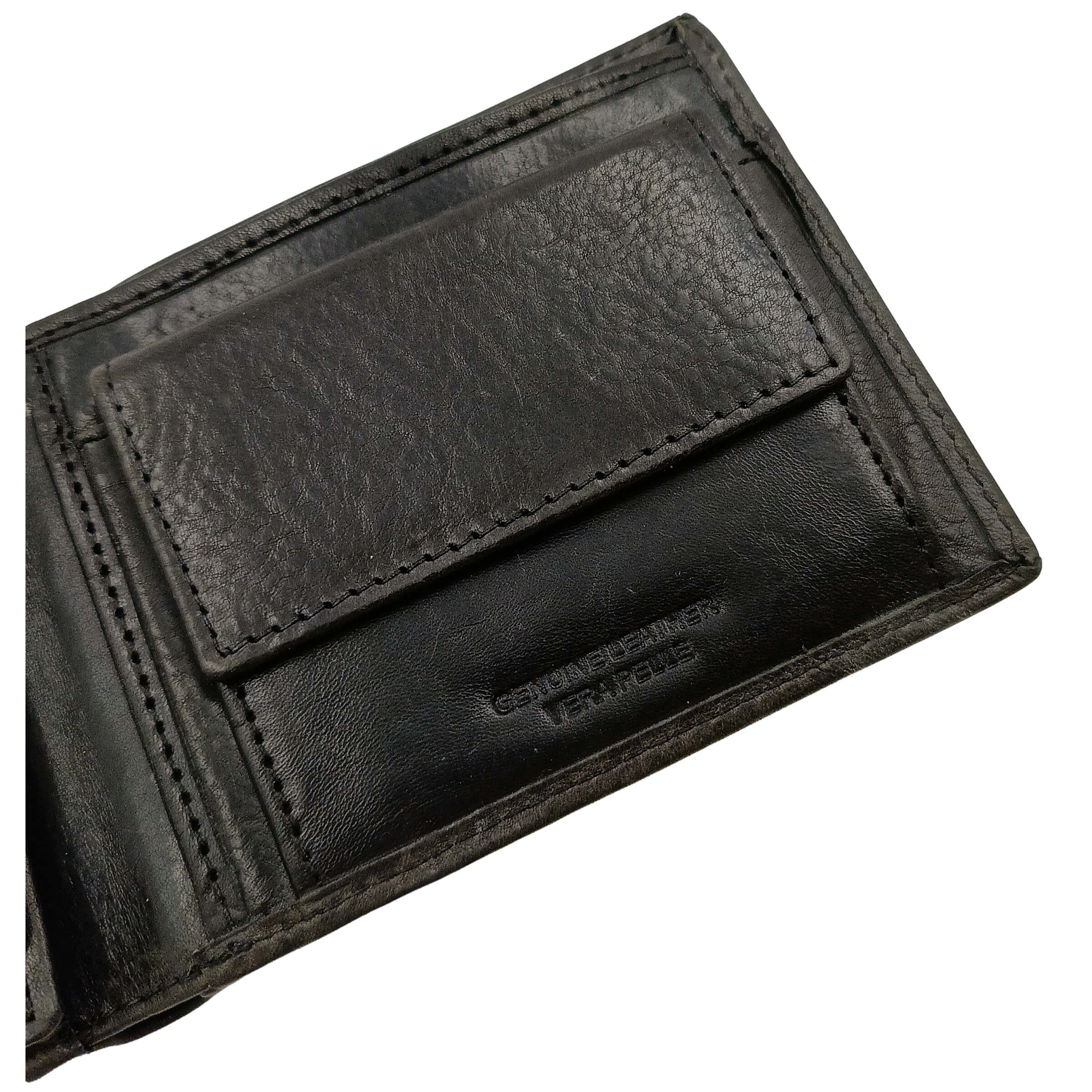 • Materiale e finitura: Realizzato interamente in vera pelle con effetto invecchiato, il portafoglio offre una superficie resistente e piacevole al tatto, progettata per evolvere esteticamente nel tempo mantenendo robustezza e carattere.