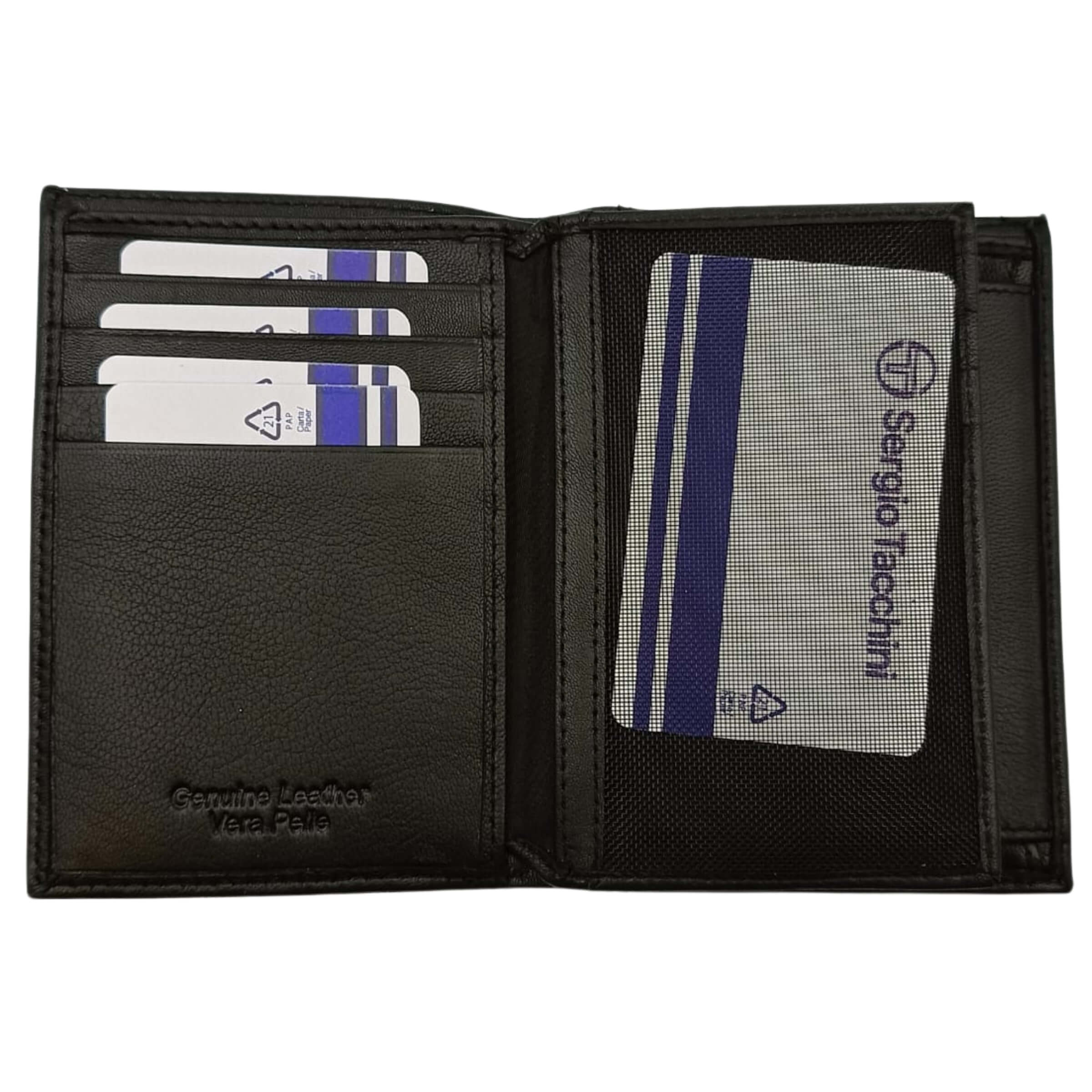 Il portafoglio verticale da uomo Sergio Tacchini in vera pelle nera è l'accessorio ideale per chi cerca praticità, eleganza e resistenza in un unico prodotto. Caratterizzato da un design essenziale e professionale, si adatta perfettamente alla vita quotidiana, grazie alla sua struttura interna ben organizzata. Il logo impresso in rilievo dona un tocco di autenticità, mentre la pelle naturale conferisce una sensazione morbida e piacevole al tatto.• Vera pelle: Realizzato in vera pelle di alta qualità, resistente e morbida, pensata per durare nel tempo e per un uso quotidiano comodo ed elegante.• Design verticale compatto: La forma sottile e slanciata permette di inserire il portafoglio nella tasca senza creare spessore, rendendolo ideale anche per chi indossa pantaloni dal taglio moderno.• 8 slot per carte: Otto alloggiamenti per carte di credito, tessere sanitarie, badge o altre card, per tenere tutto sempre a portata di mano in modo ordinato.• 3 tasche supplementari: Perfette per custodire ricevute, biglietti da visita o piccoli documenti da tenere separati.• 1 scomparto banconote: Ampio e comodo, adatto a banconote di ogni formato e documenti più grandi.• Finestra trasparente pieghevole: Ideale per esibire carta d’identità, patente o badge in modo immediato, con rete protettiva.• Confezione regalo: Incluso in elegante scatola firmata Sergio Tacchini, perfetta anche come regalo sobrio e di classe.• Dimensioni compatte: 12,5 x 9 x 2,7 cm, perfette per un uso quotidiano senza rinunciare alla capienza e all’organizzazione.Il portafoglio verticale nero Sergio Tacchini è un perfetto equilibrio tra stile classico e funzionalità moderna. Una scelta raffinata per l’uomo che desidera distinguersi con discrezione, nella quotidianità come nelle occasioni più eleganti.