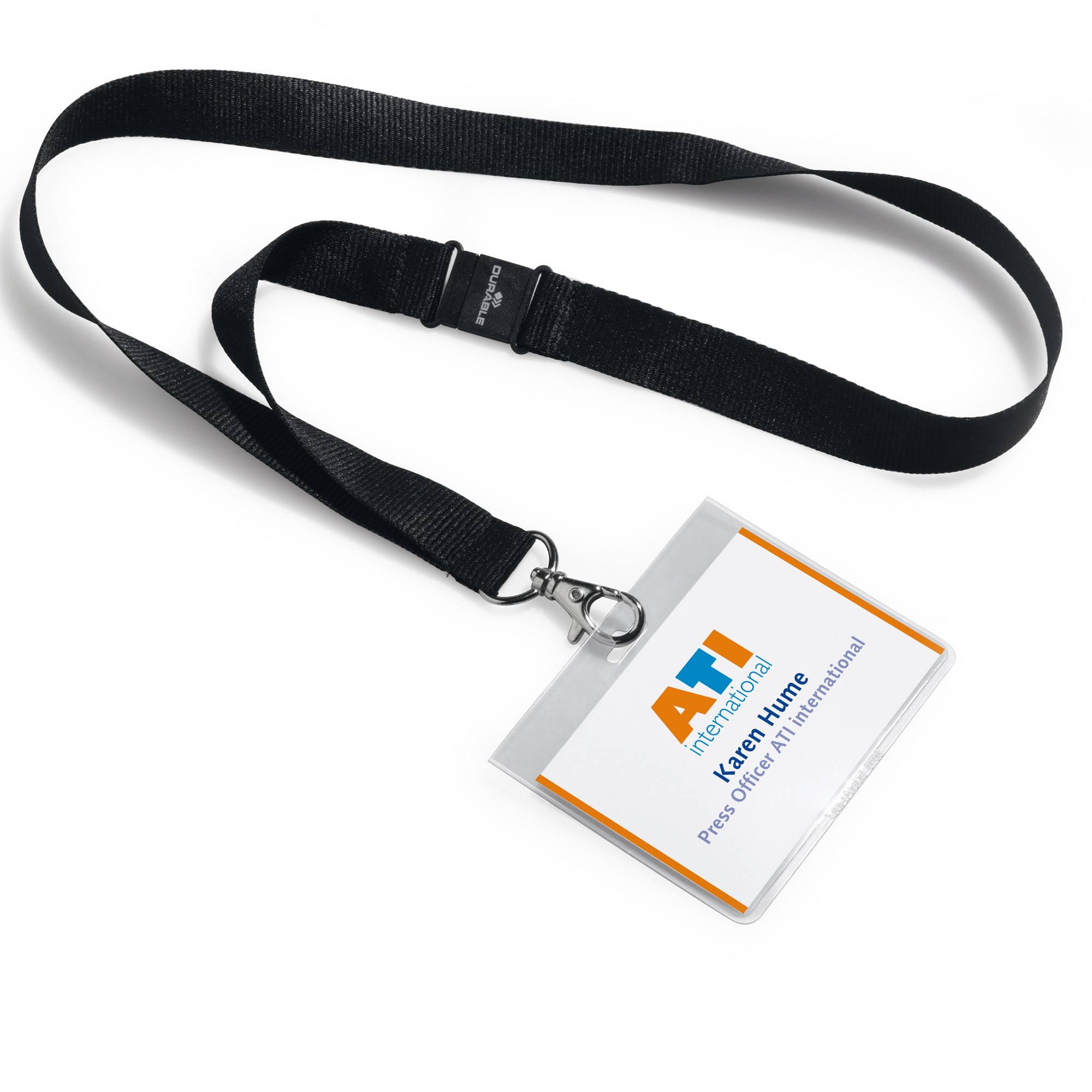 PORTANOME 6X9CM CON CORDONCINO IN TESSUTO NERO DA 20MM (LUNGHEZZA 44CM) DOTATO DI CLIP DI SICUREZZA ANTISOFFOCAMENTO E MOSCHETTONE IN METALLO. UNA VOLTA AGGANCIATO EVITA LA FUORIUSCITA ACCIDENTALE DELL'INSERTO. FORNITO CON INSERTO IN CARTONCINO PERSONALIZZABILE, CERTIFICATO PEFC.
