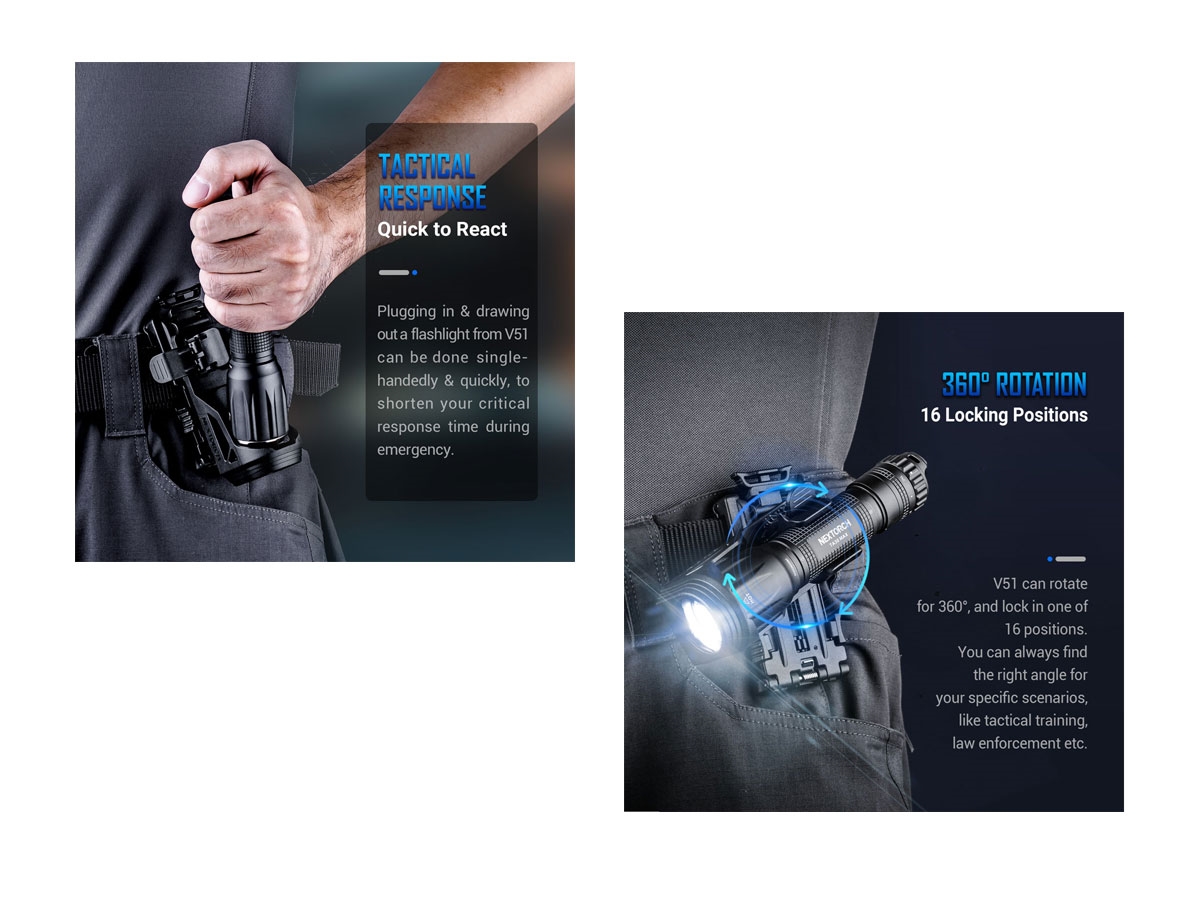 Nextorch PORTATORCIA POLIMERO TATTICO (V51)Il supporto per torcia tattica a estrazione rapida NEXTORCH V51 è un aggiornamento del classico V5, con un morsetto per la cintura migliorato: può essere liberamente staccato ed è compatibile con cinture fino a 55 mm di larghezza e MOLLE. Come il V5, il V51 è ruotabile di 360 ° con 16 posizioni di blocco. Oltre a tenere e posizionare la torcia nella giusta angolazione, V51 ti consente anche di estrarre rapidamente la torcia o di bloccarla saldamente.