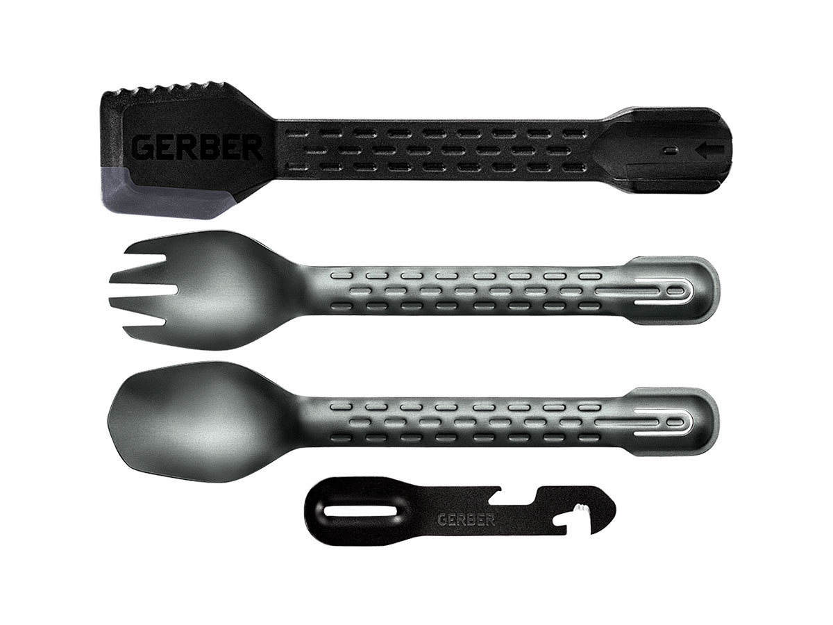 Il ComplEAT comprende una forchetta, un cucchiaio, una spatola ed uno strumento multiuso a 4 funzioni che offre un pelapatate, un apripacchi seghettato e un apribottiglie/lattine. Tutti gli elementi si annidano e si incastrano insieme.