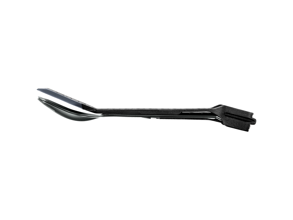 Il ComplEAT comprende una forchetta, un cucchiaio, una spatola ed uno strumento multiuso a 4 funzioni che offre un pelapatate, un apripacchi seghettato e un apribottiglie/lattine. Tutti gli elementi si annidano e si incastrano insieme.