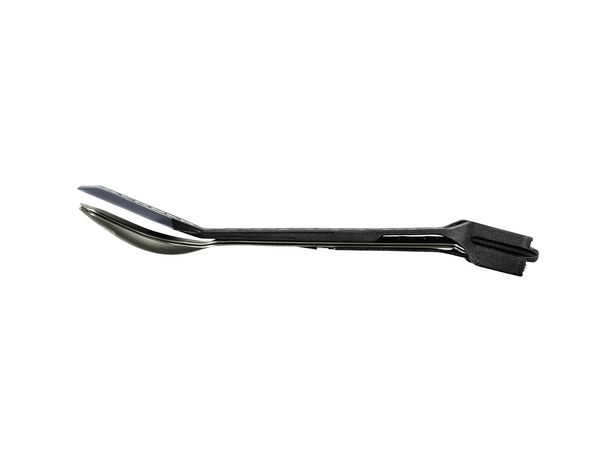 Il ComplEAT comprende una forchetta, un cucchiaio, una spatola ed uno strumento multiuso a 4 funzioni che offre un pelapatate, un apripacchi seghettato e un apribottiglie/lattine. Tutti gli elementi si annidano e si incastrano insieme.