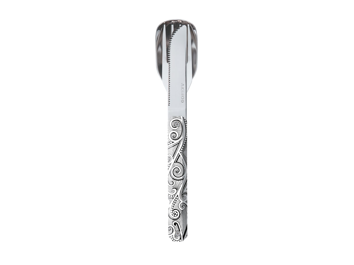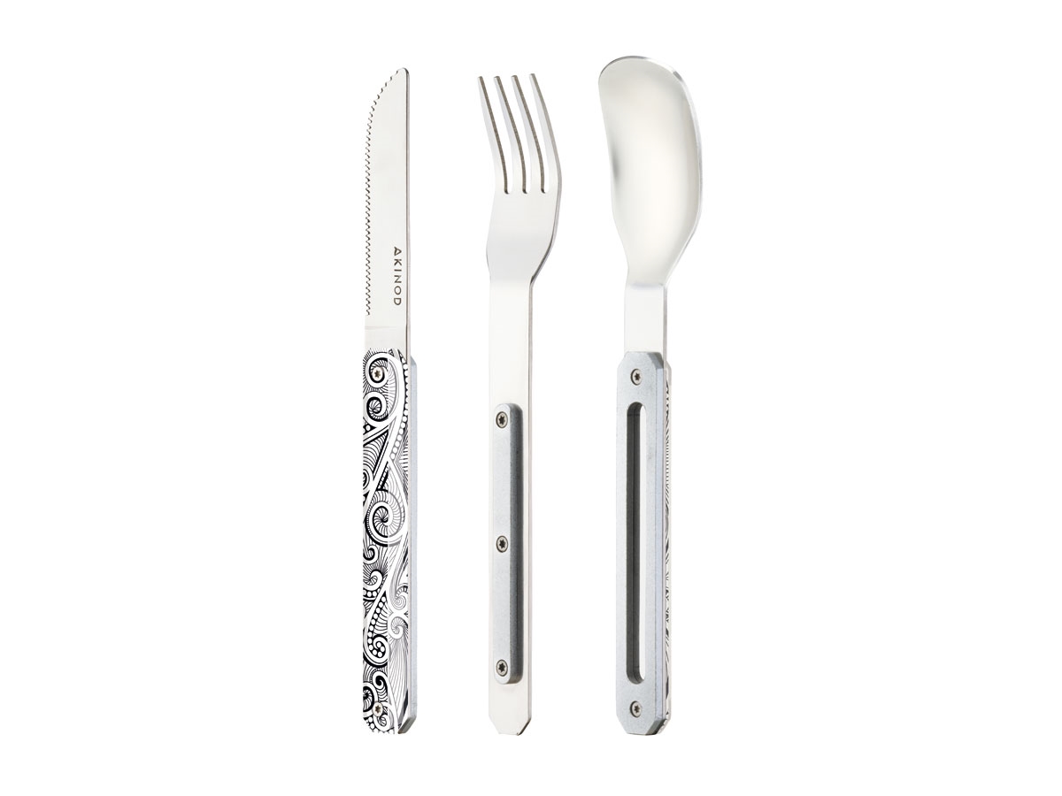 L' Akinod Straight Magnetic 12H34 è un pratico set di posate adatto ad una gita in campeggio, un'escursione o in ufficio. Il set è composto da una forchetta, un cucchiaio ed un coltello con lama seghettata e si assembla in modo compatto grazie alla presenza di magneti. Il suo design elegante e raffinato lo rende unico e la vasta gamma di motivi dei manici permette ad ogni membro del gruppo o della famiglia di selezionare il proprio Akinod 12H34. E' disponibile sia con finitura lucida che con finitura lucida nera.