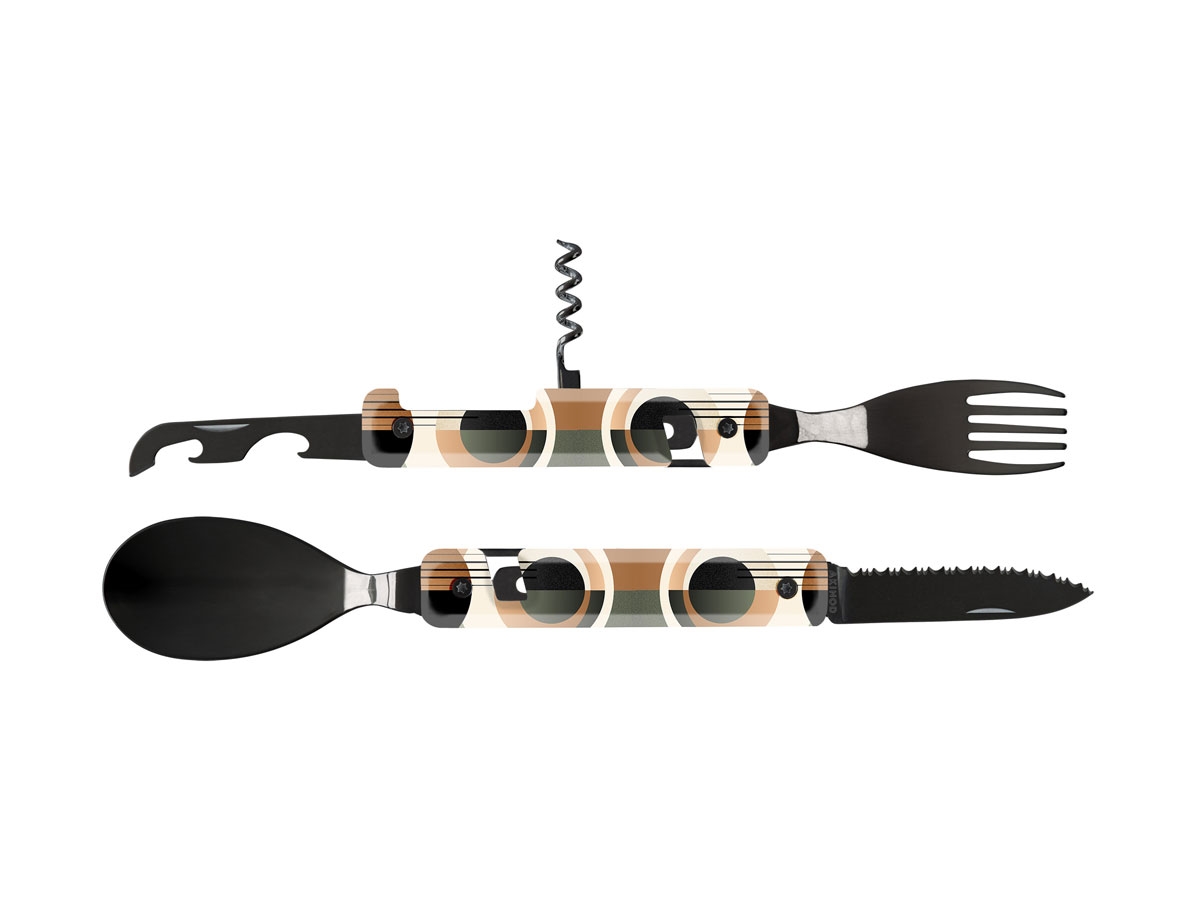 L' Akinod Multifunction 13H25 è un pratico set di posate adatto ad una gita in campeggio, un'escursione o in ufficio. Il set è composto da una forchetta, un cucchiaio ed un coltello con lama seghettata, ma anche da un apribottiglie, un apriscatole ed un cavatappi. Tutte le parti si assemblano l'una sull'altra in modo compatto grazie alla presenza di magneti incorporati. Il suo design elegante e raffinato lo rende unico e la vasta gamma di motivi dei manici permette ad ogni membro del gruppo o della famiglia di selezionare il proprio Akinod 13H25. E' disponibile sia con finitura lucida che con finitura lucida nera.