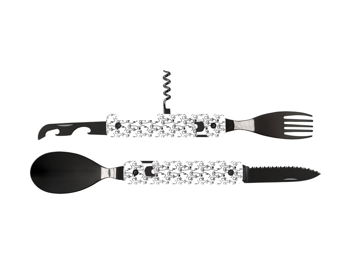 L' Akinod Multifunction 13H25 è un pratico set di posate adatto ad una gita in campeggio, un'escursione o in ufficio. Il set è composto da una forchetta, un cucchiaio ed un coltello con lama seghettata, ma anche da un apribottiglie, un apriscatole ed un cavatappi. Tutte le parti si assemblano l'una sull'altra in modo compatto grazie alla presenza di magneti incorporati. Il suo design elegante e raffinato lo rende unico e la vasta gamma di motivi dei manici permette ad ogni membro del gruppo o della famiglia di selezionare il proprio Akinod 13H25. E' disponibile sia con finitura lucida che con finitura lucida nera.