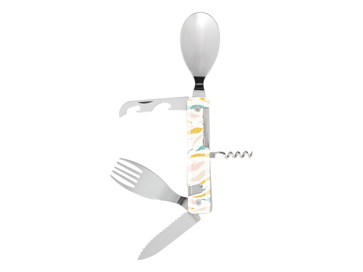 L' Akinod Multifunction 13H25 è un pratico set di posate adatto ad una gita in campeggio, un'escursione o in ufficio. Il set è composto da una forchetta, un cucchiaio ed un coltello con lama seghettata, ma anche da un apribottiglie, un apriscatole ed un cavatappi. Tutte le parti si assemblano l'una sull'altra in modo compatto grazie alla presenza di magneti incorporati. Il suo design elegante e raffinato lo rende unico e la vasta gamma di motivi dei manici permette ad ogni membro del gruppo o della famiglia di selezionare il proprio Akinod 13H25. E' disponibile sia con finitura lucida che con finitura lucida nera.