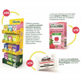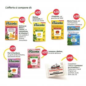 PACCO RICOLA JUICY DA 60 ASTUCCI + 10 ASTUCCI LAMPONE E MELISSA + 24 FISHERMAN BIANCA (94PZ)
