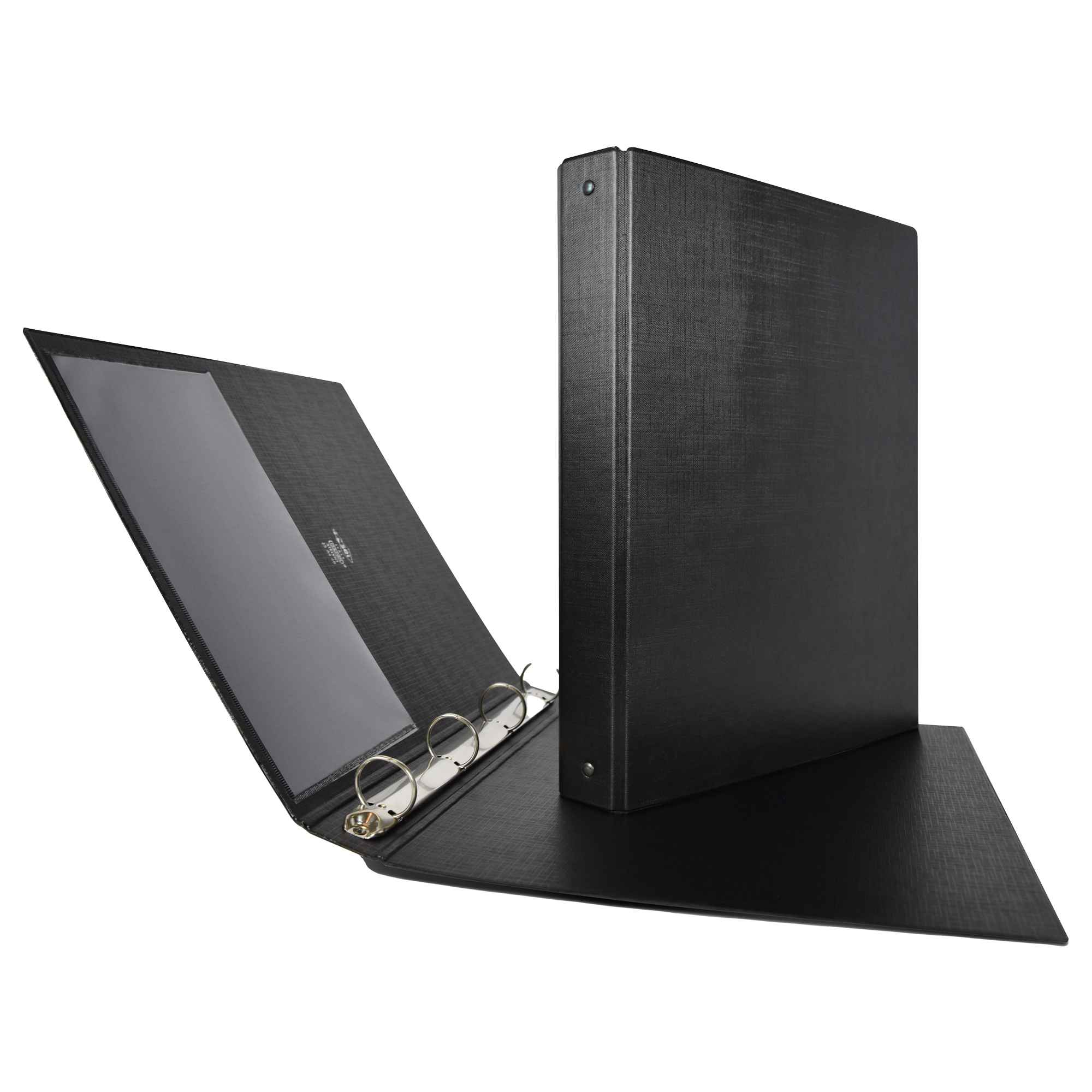 RACCOGLITORE IN COLPAN (CARTONE RIVESTITO IN PVC) CON MECCANISMO A 4 ANELLI TONDI E TASCA INTERNA TRASPARENTE. UTILI IN UFFICIO, A SCUOLA E A CASA. FORMATO ESTERNO: 255X310 MM. FORMATO CONTENUTO: 220X300 MM (A4). DORSO: 25 MM. DIAMETRO ANELLI: 16 MM. COLORE NERO.