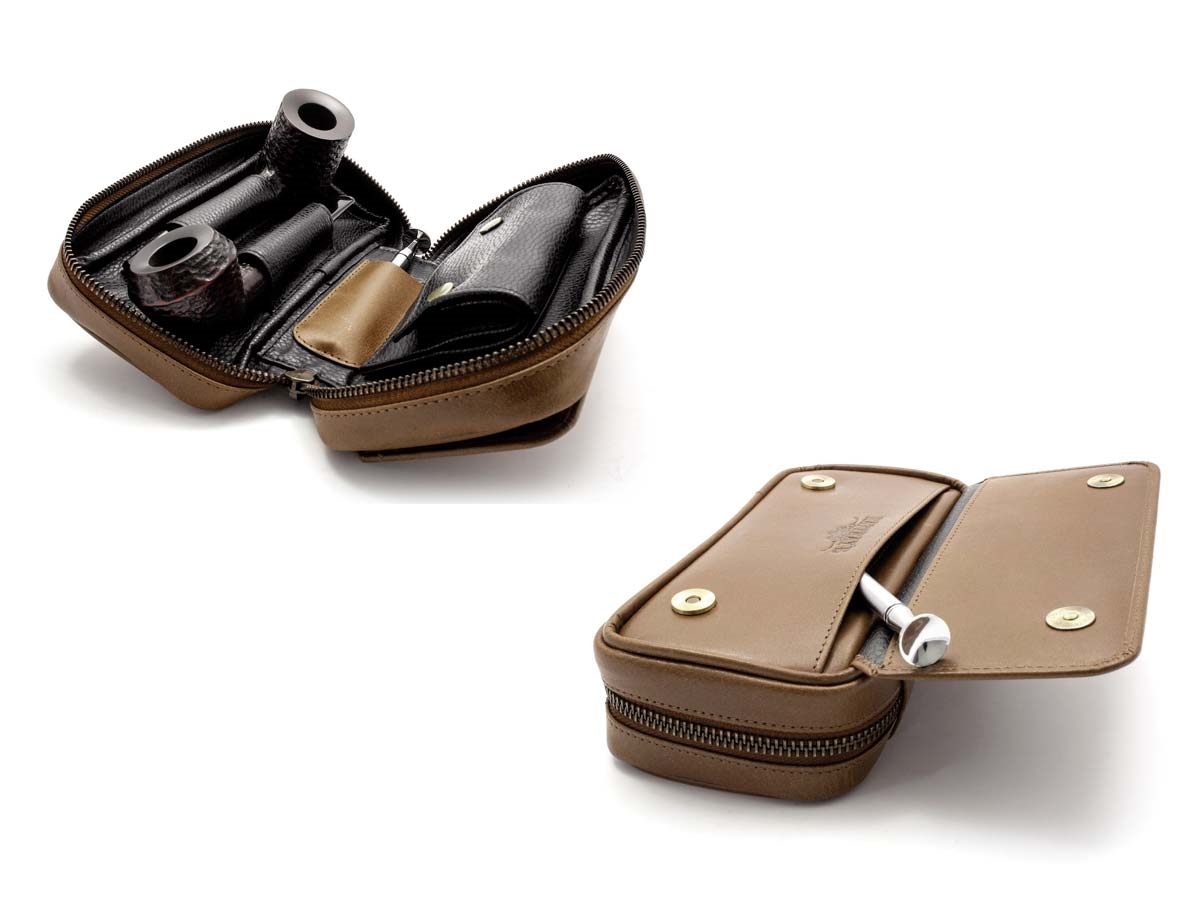 Borsa per 2 pipe realizzata con una resistente pelle di vacchetta che ricorda il colore marrone-dorato dell'orzo maltato. Le cerniere e i bottoni magnetici sono realizzati in ottone, conferendo alla serie Whisky un carattere nostalgico. Uno scomparto frontale serve per riporre l'attrezzatura. Con il passare del tempo la pelle svilupperà anche una bella patina.