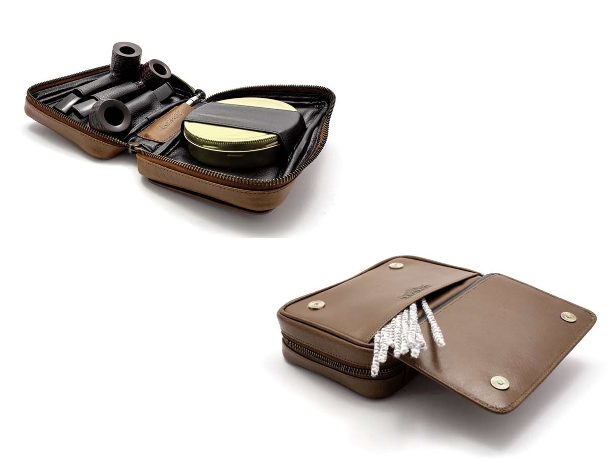 Borsa per 3 pipe realizzata con una resistente pelle di vacchetta che ricorda il colore marrone-dorato dell'orzo maltato. Le cerniere e i bottoni magnetici sono realizzati in ottone, conferendo alla serie Whisky un carattere nostalgico. Uno scomparto frontale serve per riporre l'attrezzatura. Con il passare del tempo la pelle svilupperà anche una bella patina.