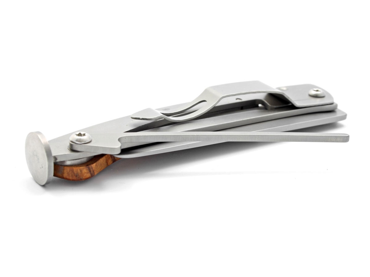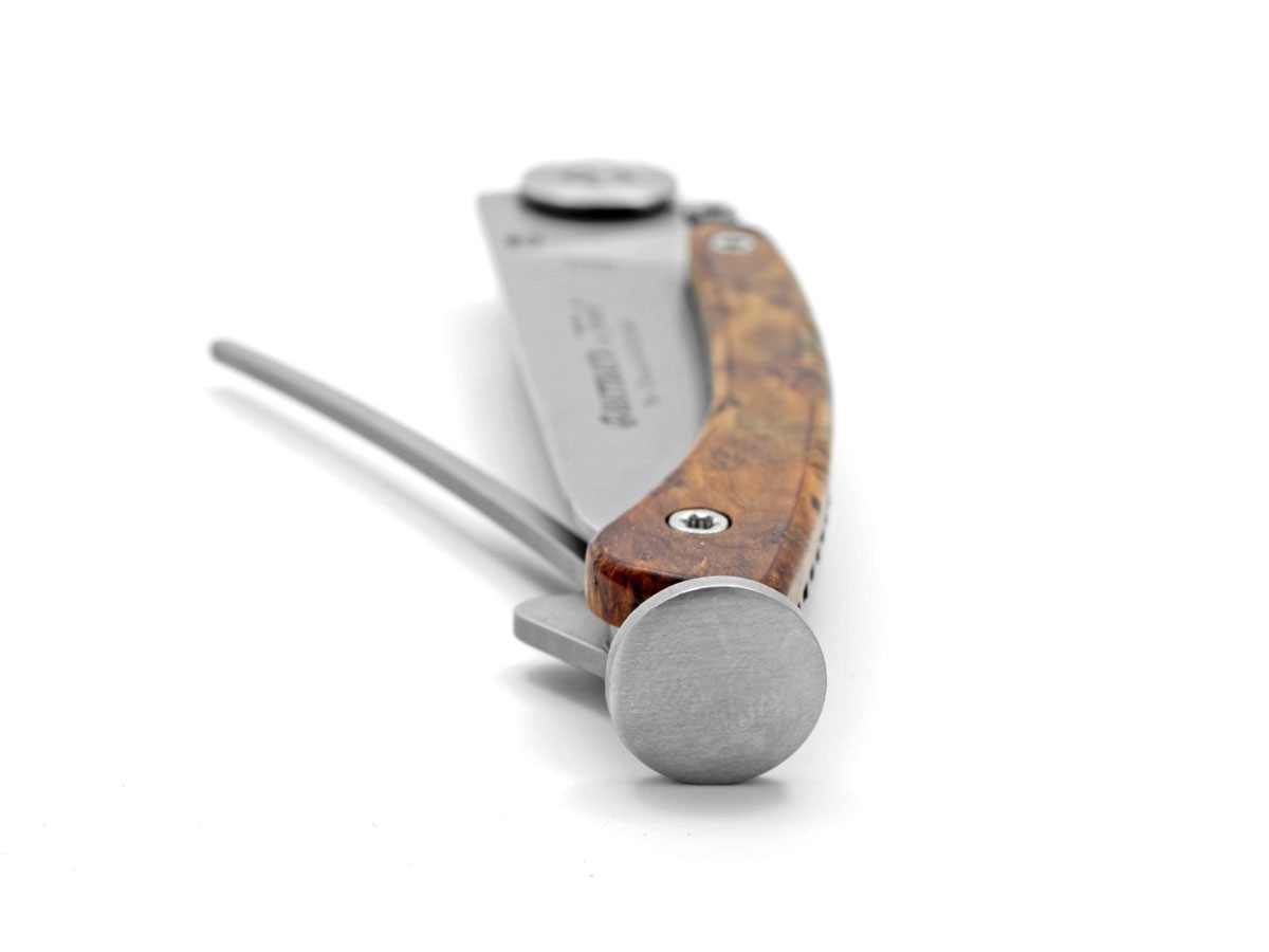Il manico è realizzato in un legno di tuya. La lama arrotondata in acciaio svedese Sandvik steel 12C27 è estremamente affilata e pulisce con sicurezza il fornello, il pigino posizionato ad un'estremità del manico pressa il tabacco ed il perno rimuove la cenere. E' dotato di un blocco lama LinerLock e di una clip per agganciarlo ad una borsa o in tasca