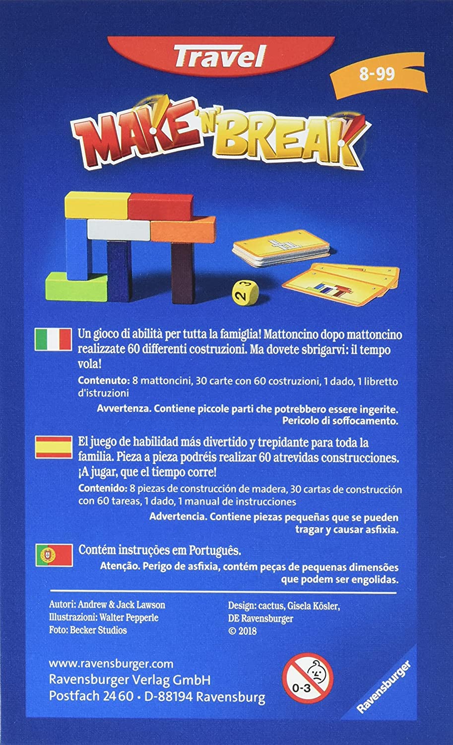 Ravensburger presenta il classico successo di Make'n'Break nel formato travel. Un gioco di abilità per tutta la famiglia. Mattoncino dopo mattoncino realizzate 60 differenti costruzioni, ma dovete sbrigarvi: il tempo vola. - Travel: la versione portatile dei successi Ravensburger - A partire dagli 8 anni in su - Un gioco di abilità per tutta la famiglia: realizzate - - - 60 costruzioni differenti - Da 2 a 4 giocatori