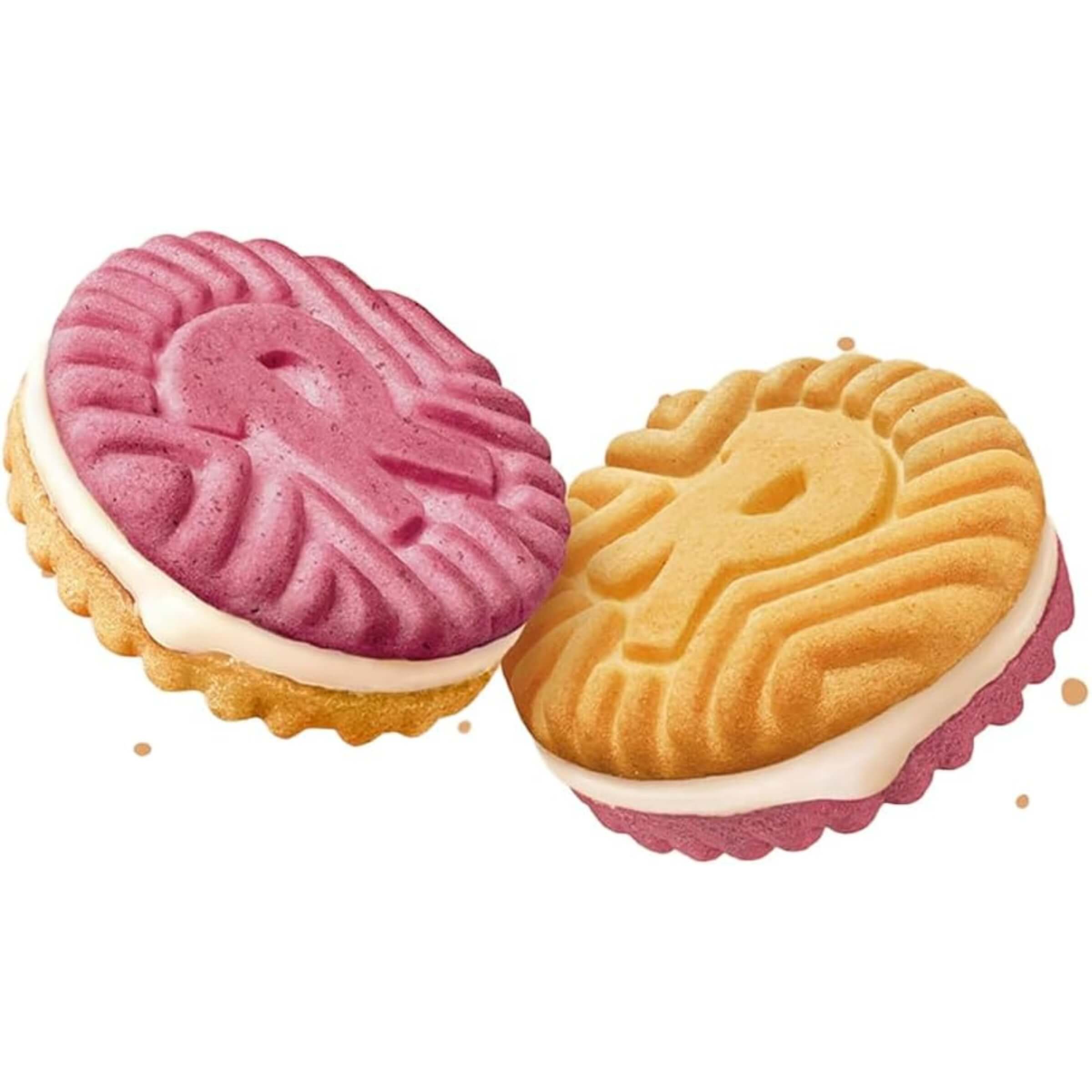 Ingredienti: Biscotti 73% (farina di grano tenero, zucchero, olio di girasole, amido di frumento, estratto di malto d’orzo 1%, concentrato di barbabietola e carota, amido di mais, purea disidratata di frutti di bosco in proporzione variabile: fragola, mora, lampone, mirtillo, ribes nero 0,4%, sale, agenti lievitanti: difosfato disodico, carbonato acido di sodio, cacao, aroma), crema 27% (grasso e olio vegetali non idrogenati: cacao, girasole, zucchero, destrosio, siero di latte in polvere, amido di frumento, formaggio in polvere, maltodestrina, latticello in polvere, aromi). Può contenere tracce di uovo, senape, frutta a guscio e soia.