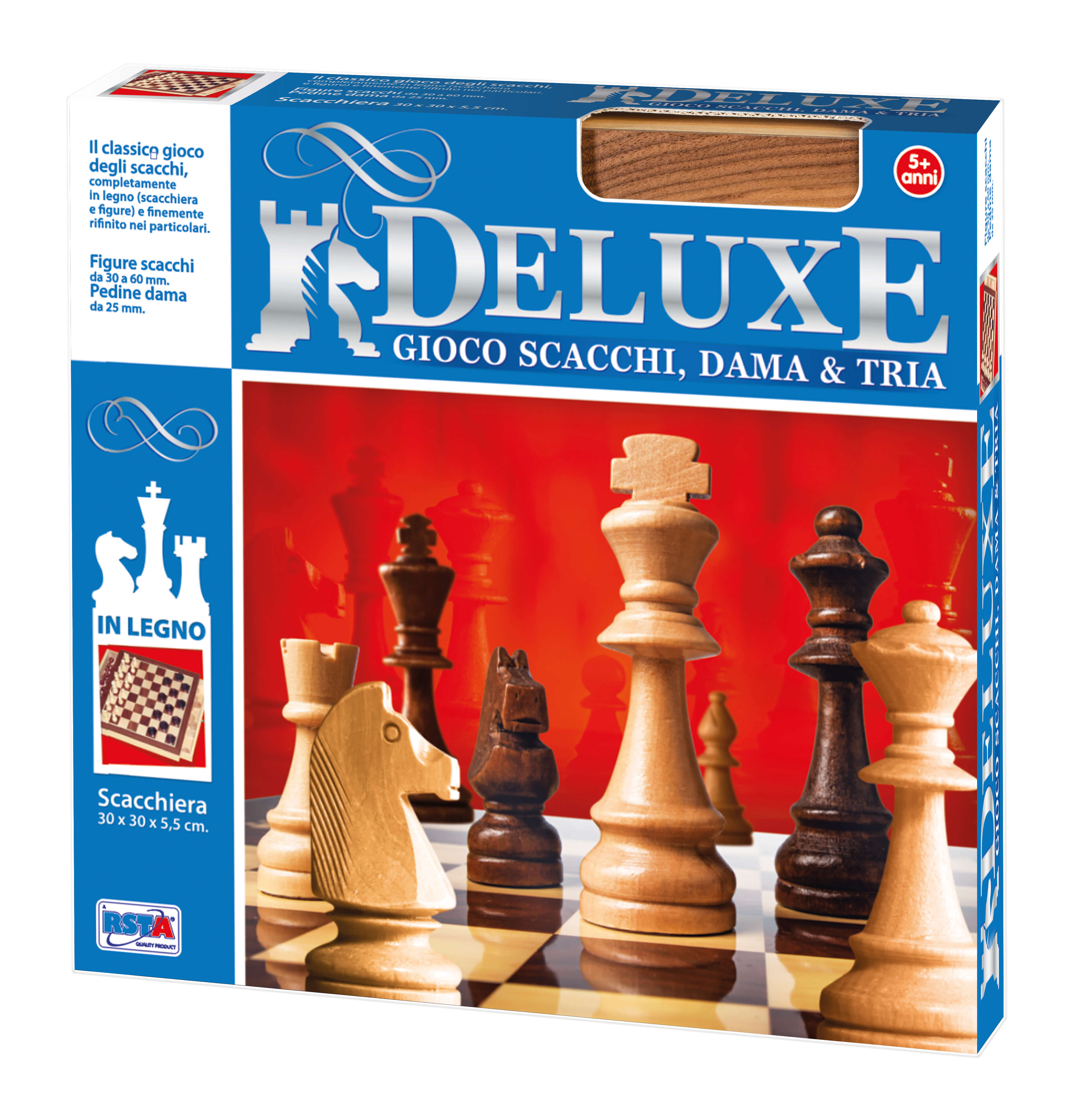 Il gioco in scatola Deluxe Scacchi, Dama & Tria è un classico che offre tre giochi in uno, perfetto per adulti e bambini a partire dai 5 anni. Questo set combina eleganza e funzionalità, grazie alla scacchiera e ai pezzi realizzati interamente in legno.• Materiali di Alta Qualità: Completamente in legno, questo set offre una scacchiera di dimensioni 30 x 30 x 5,5 cm e pezzi finemente rifiniti nei dettagli. Le figure degli scacchi variano da 30 a 60 mm, mentre le pedine per la dama misurano 25 mm.• Tre Giochi in Uno: Deluxe Scacchi, Dama & Tria include tutto il necessario per giocare a scacchi, dama e tria, offrendo ore di divertimento e sfida per tutta la famiglia. Ogni gioco è progettato per stimolare la logica, la strategia e la concentrazione.• Design Elegante e Resistente: La scacchiera e i pezzi in legno non solo sono belli da vedere, ma anche resistenti e durevoli nel tempo. Questo set è perfetto sia per le partite casuali che per quelle più competitive.• Stimola la Mente: Ideale per allenare il pensiero logico e la strategia, Deluxe Scacchi, Dama & Tria è uno strumento educativo che aiuta i bambini a sviluppare la pazienza e la capacità di risolvere problemi, offrendo allo stesso tempo un'ottima sfida anche per gli adulti.• Facile da Trasportare: La confezione compatta permette di portare il gioco ovunque si desideri, rendendolo ideale per le vacanze o per le serate in famiglia. Il set è pronto per l'uso, basta aprire la scatola e iniziare a giocare.Il gioco in scatola Deluxe Scacchi, Dama & Tria è il regalo perfetto per gli appassionati di giochi da tavolo, offrendo un'esperienza di gioco completa e raffinata. Con la sua combinazione di qualità, eleganza e funzionalità, questo set è un must-have per ogni collezionista.