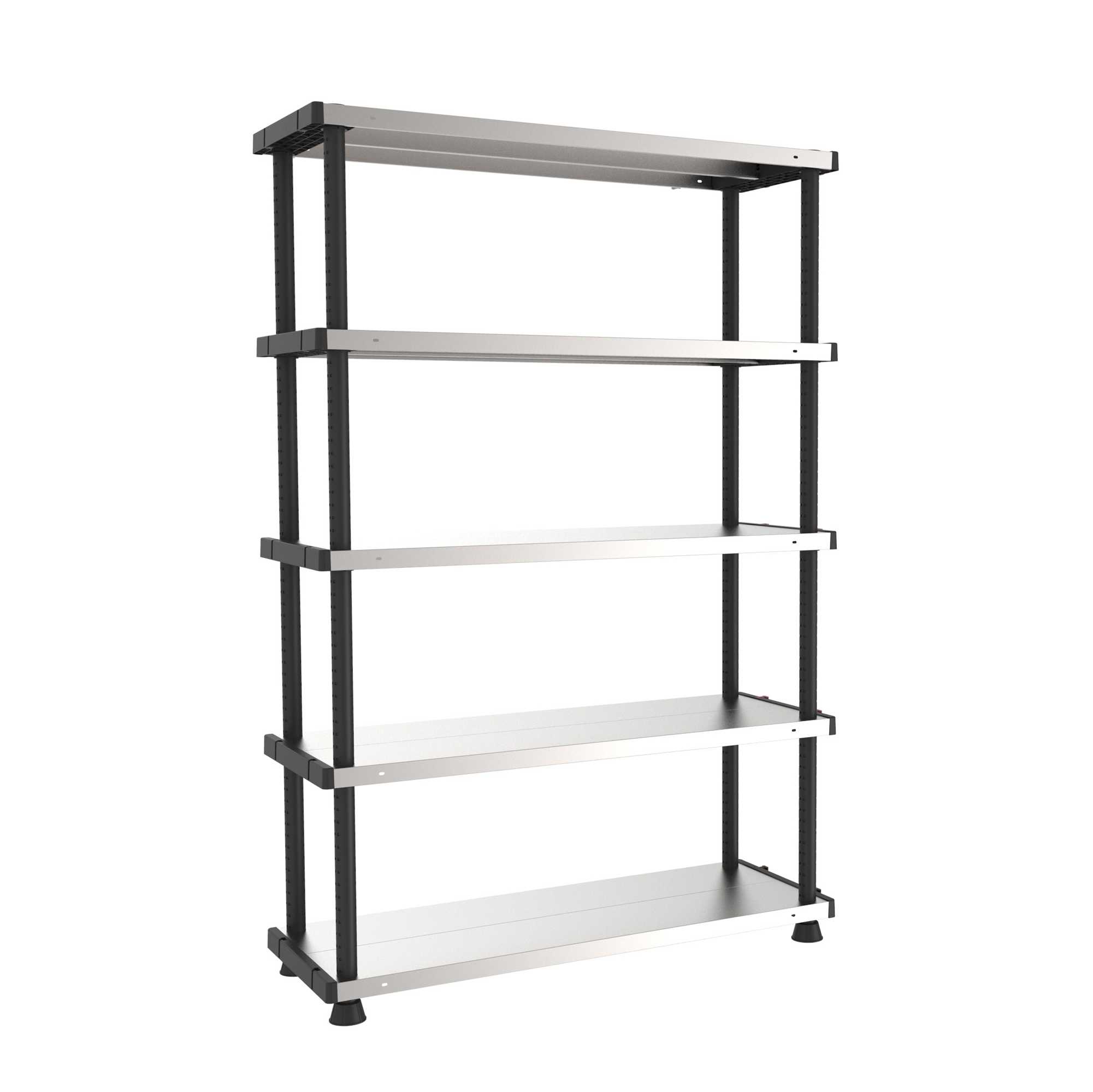 SCAFFALE COMPOSTO DA 4 MONTANTI VERTICALI IN PLASTICA NERA CON PIEDINI REGOLABILI IN ALTEZZA. 5 RIPIANI IN METALLO REGOLABILI CON PROFONDITA' DI 45CM CON PORTATA MASSIMA DI 120KG PER RIPIANO. MONTAGGIO DELLO SCAFFALE STIMATO IN 10''. POSSIBILITA' DI FISSAGGIO A PARETE.