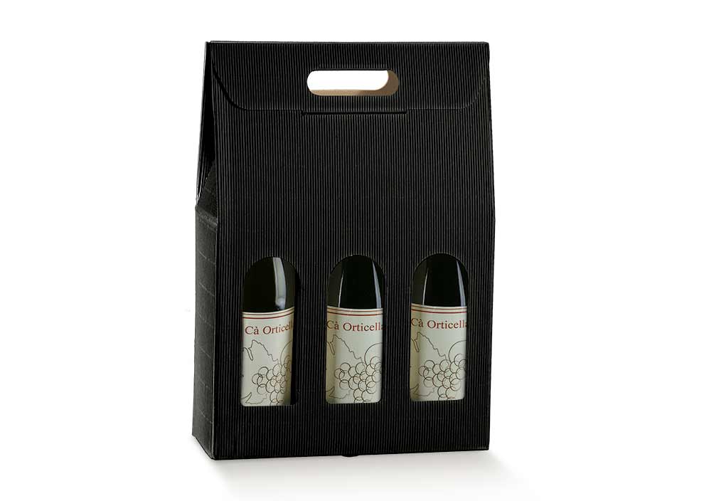 Scatola in cartone accoppiato con maniglia e finestra frontale per confezionare 1 bottiglia verticale modello bordolese, borgognotta.DIMENSIONI:Lunghezza 90 mmLarghezza 90 mmAltezza 385 mmConfezione 50 Pezzi