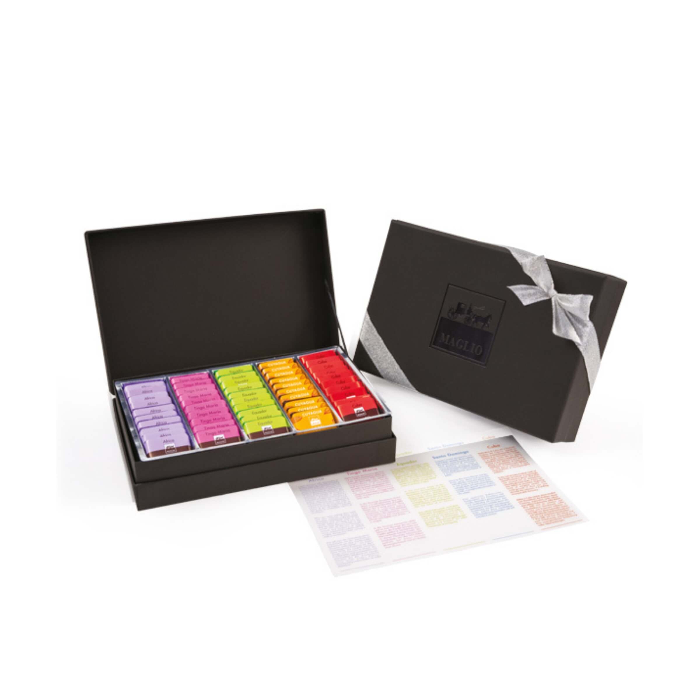 La scatola Mini Tavoletta Origine è una confezione elegante che contiene una selezione di mini tavolette monorigine di cioccolato fondente, ognuna proveniente da diverse piantagioni del mondo. Ogni cioccolato offre un’esperienza unica di gusto, grazie alle specifiche condizioni territoriali e climatiche delle piantagioni di origine.