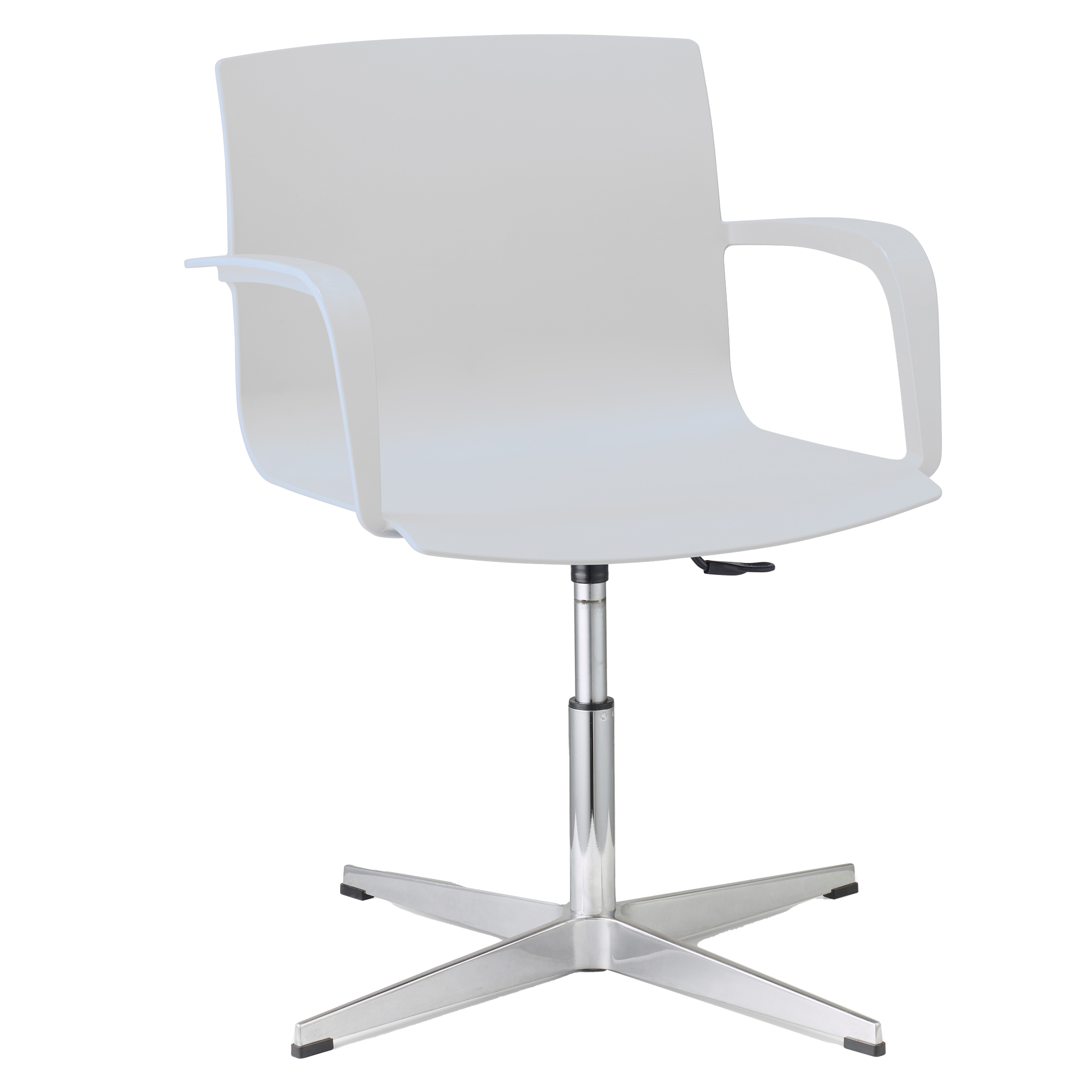 SEDIA GIREVOLE 100% POLIPROPILENE CON PIEDINI - ELEVAZIONE A GAS - BASE ALLUMINIO PRESSOFUSO - COMPLETA DI BRACCIOLI. ALT. TOT: 81-92CM PROF.TOT: 63CM ALT.SCHIENALE: 37CM LARGH.SCHIENALE: 48CM LARGH. SEDILE: 48CM PROF.SEDILE: 50CM ALT.SEDILE: 45-56CM.