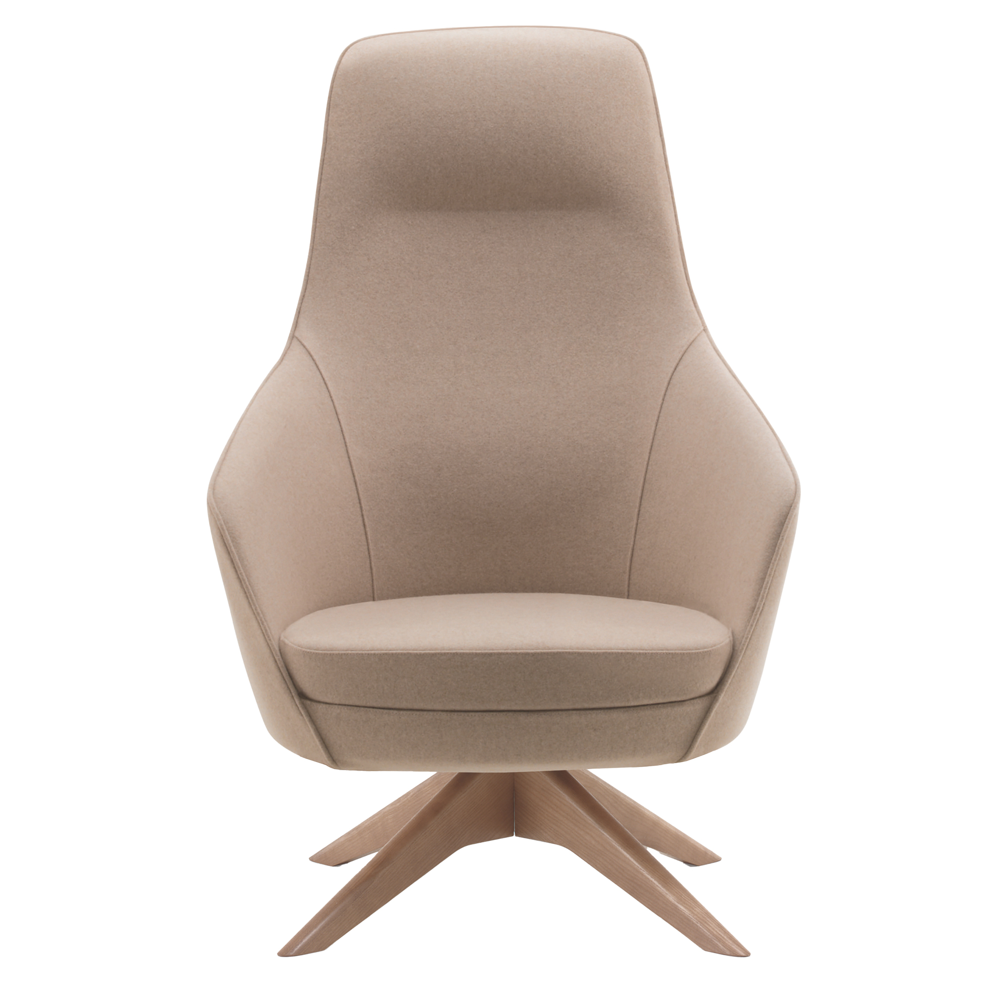 POLTRONCINA SU BASAMENTO GIREVOLE IN LEGNO DI FRASSINO VERNICIATO. RIVESTIMENTO SEDUTA IN TESSUTO ''PLUS - ECO LEATHER'' IDROREPELLENTE, FACILE DA PULIRE, SENZA FLATATI E FLAME RETARDANT. ALT.TOT.: 111CM PROF.TOT.: 80CM LARG.TOT.: 75CM.