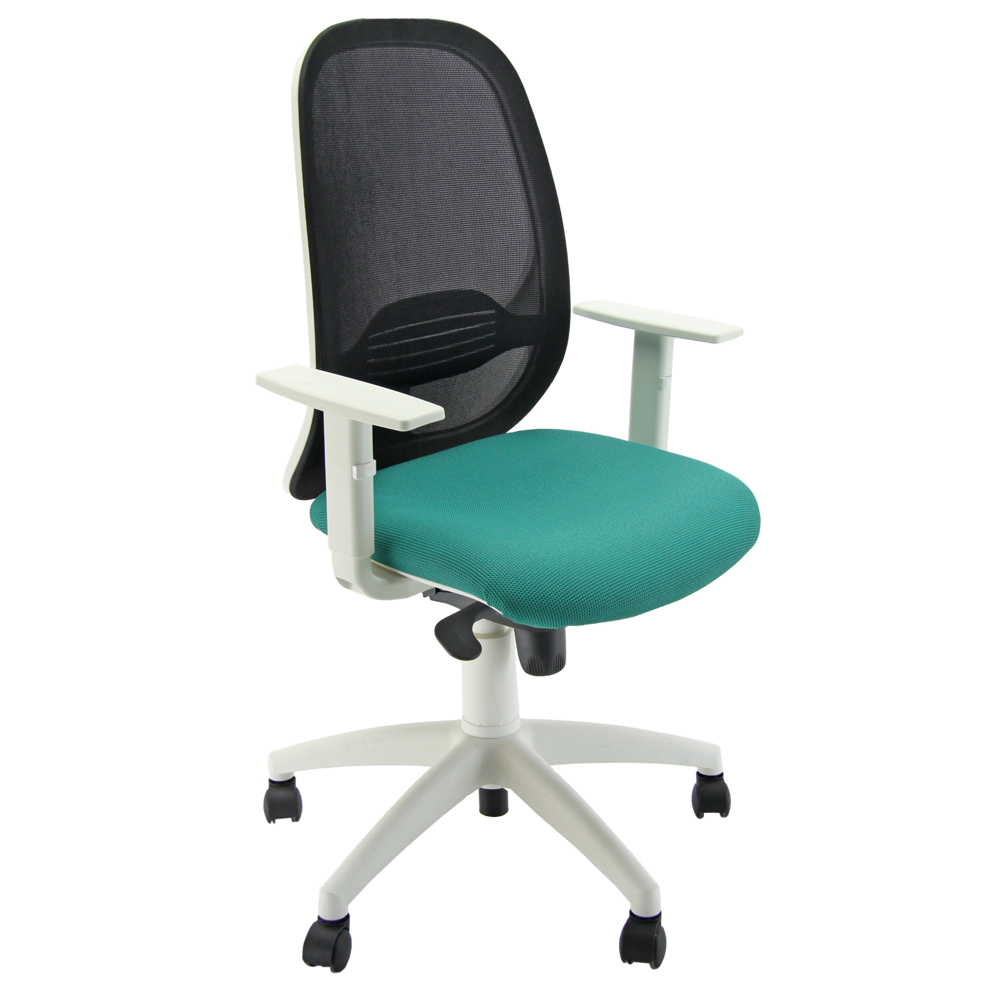SEDIA GIREVOLE SU RUOTE CON SEDILE IN RETE PORTANTE E SCHIENALE IN RETE NERA, ELEVAZIONE A GAS. SUPPORTO LOMBARE REGOLABILE, MECCANISMO SYNCRO TRA SEDILE E SCHIENALE, A CONTATTO PERMANENTE. RIVESTIMENTO SEDUTA IN TESSUTO ''SUPER-TARGET'' 100% POLIESTERE, IDROREPELLENTE E ANTIMACCHIA, REAZIONE AL FUOCO CLASSE 1. COMPLETA DI BRACCIOLI REGOLABILI. ALT.TOT: 102-113CM PROF.TOT: 68CM ALT.SCHIENALE: 60CM LARGH.SCHIENALE:48CM LARGH.SEDILE: 48CM PROF.SEDILE: 46CM ALT.SEDILE: 42-54CM.