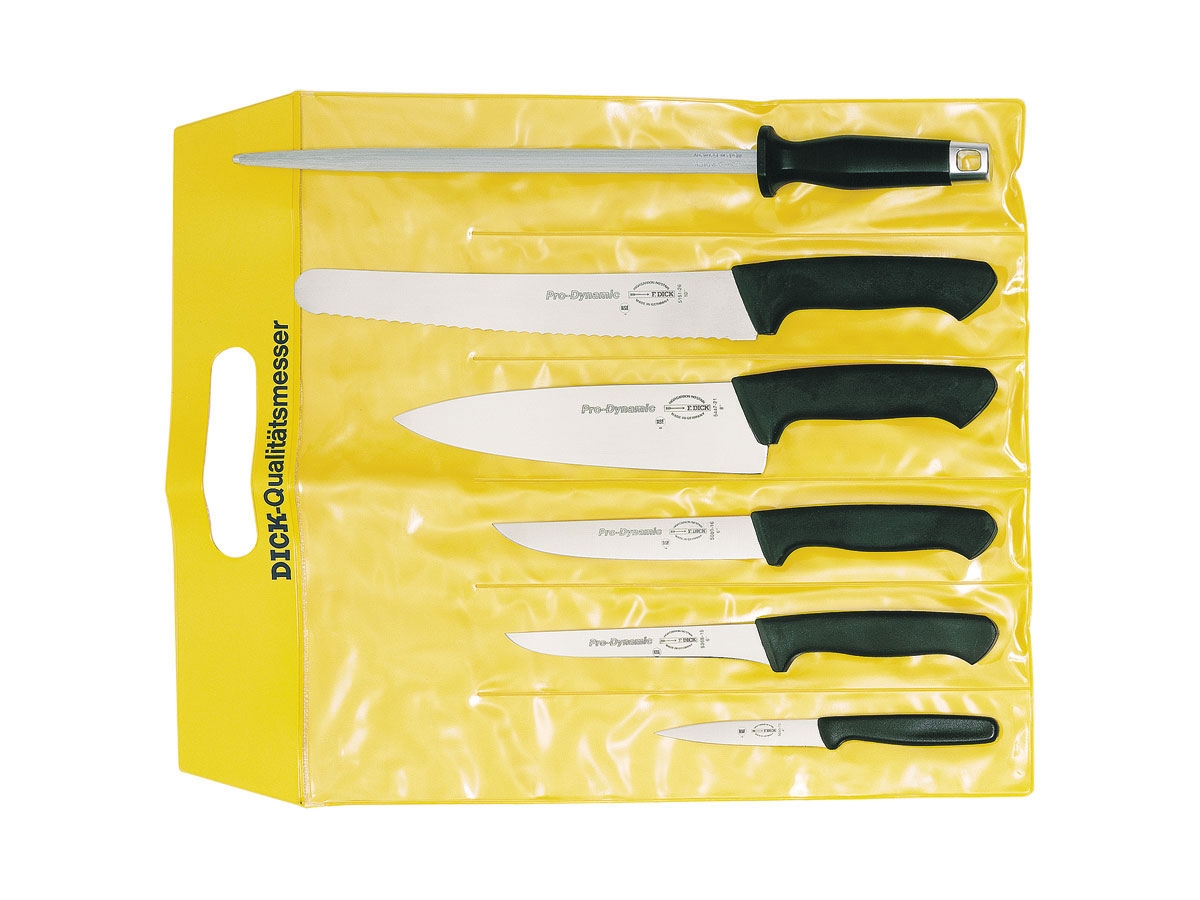 Dick PRODYNAMIC SET 6 PZ 8510000PRODYNAMIC - Set 6 pzMANICO: plasticaContiene:1 x Acciarino cm 301 x Pane cm 201 x Cuoco cm 211 x Disosso stretto cm 151 x Petto Francese cm 161 x Spelucchino cm 10