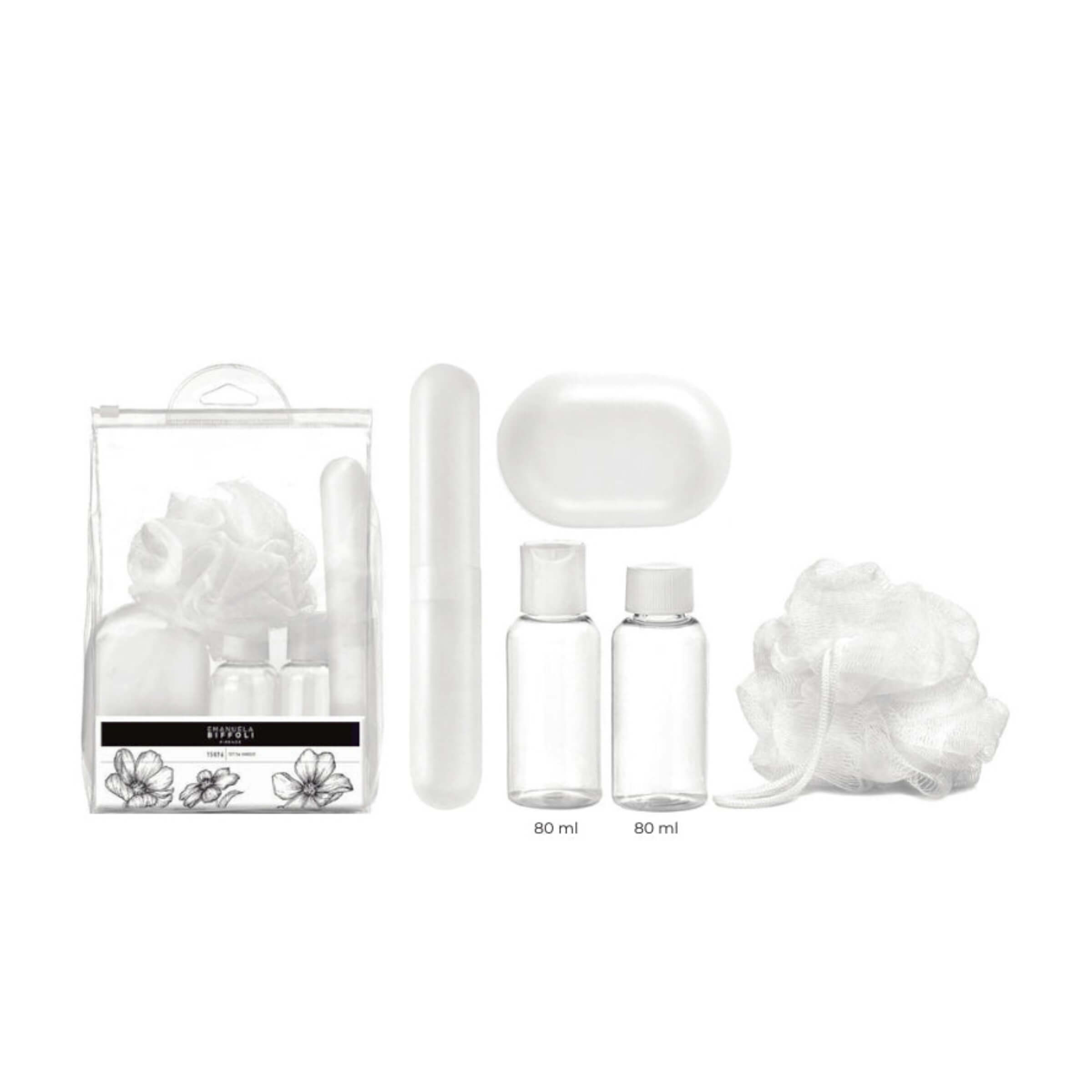 Perfetto per organizzare e trasportare tutto ciò che serve per la cura personale durante i viaggi. Questo pratico set è pensato per chi desidera portare con sé i propri prodotti per l'igiene, senza rinunciare alla comodità e all’ordine.• Composizione del Set:1 Bottiglia con Chiusura a Scatto da 80 ml: Ideale per contenere liquidi come shampoo o bagnoschiuma.1 Bottiglia con Chiusura a Vite da 80 ml: Perfetta per lozioni o altri prodotti da portare sempre con te.Portasapone: Un accessorio funzionale per mantenere il sapone sempre a portata di mano, proteggendolo da contaminazioni.Portaspazzolino: Mantiene lo spazzolino al sicuro e igienicamente isolato.Spugna in Rete: Ideale per un'esperienza di pulizia delicata e piacevole, perfetta per un uso quotidiano.• Design Compatto e Pratico: La busta misura 15,5 x 5 x 22 cm, è realizzata in PVC trasparente, rendendo facile l’accesso e la visualizzazione di tutti gli elementi contenuti. Perfetta per essere riposta nel bagaglio a mano senza occupare troppo spazio.Ordine e praticità sempre con te con il Set da Viaggio Completo Biffoli. Un alleato per il viaggiatore attento ai dettagli e all'igiene, che unisce funzionalità e compattezza in un unico prodotto.