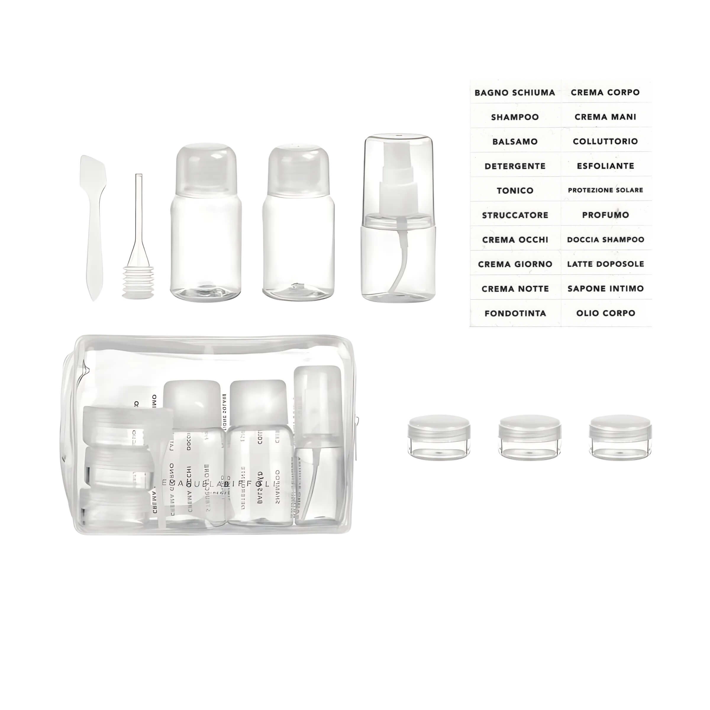 Il compagno ideale per i tuoi viaggi, pensato per garantire praticità e ordine durante i tuoi spostamenti. Questa busta portacosmetici contiene tutto il necessario per trasportare i tuoi prodotti preferiti per l'igiene e la cura del corpo, in un formato compatto e sicuro.• Contenitori in Materiale Atossico: Realizzati in plastica di alta qualità e sicura, i contenitori offrono diverse forme e capacità per adattarsi a qualsiasi esigenza. Ogni pezzo è ideato per preservare i tuoi prodotti con la massima sicurezza e igiene.• Composizione del Set:1 Bottiglia con Spray da 30 ml: Perfetta per i tuoi profumi, tonici o spray rinfrescanti.2 Bottiglie con Chiusura a Vite da 50 ml: Ideali per shampoo, balsamo o detergenti.3 Vasetti da 10 ml: Ottimi per creme viso, maschere o sieri, ideali per essere sempre a portata di mano.Set di Etichette Adesive: Include etichette pre-stampate per identificare facilmente il contenuto di ogni flacone, facilitando la tua routine quotidiana.• Dimensioni Compatte: Con una dimensione di 15 x 4,5 x 11 cm, la busta è facile da riporre nel bagaglio a mano, mantenendo i tuoi prodotti organizzati e accessibili.Porta l'essenziale con te con il Set da Viaggio Biffoli. La sua praticità e la qualità dei materiali lo rendono una scelta indispensabile per chi ama viaggiare con stile e sicurezza.