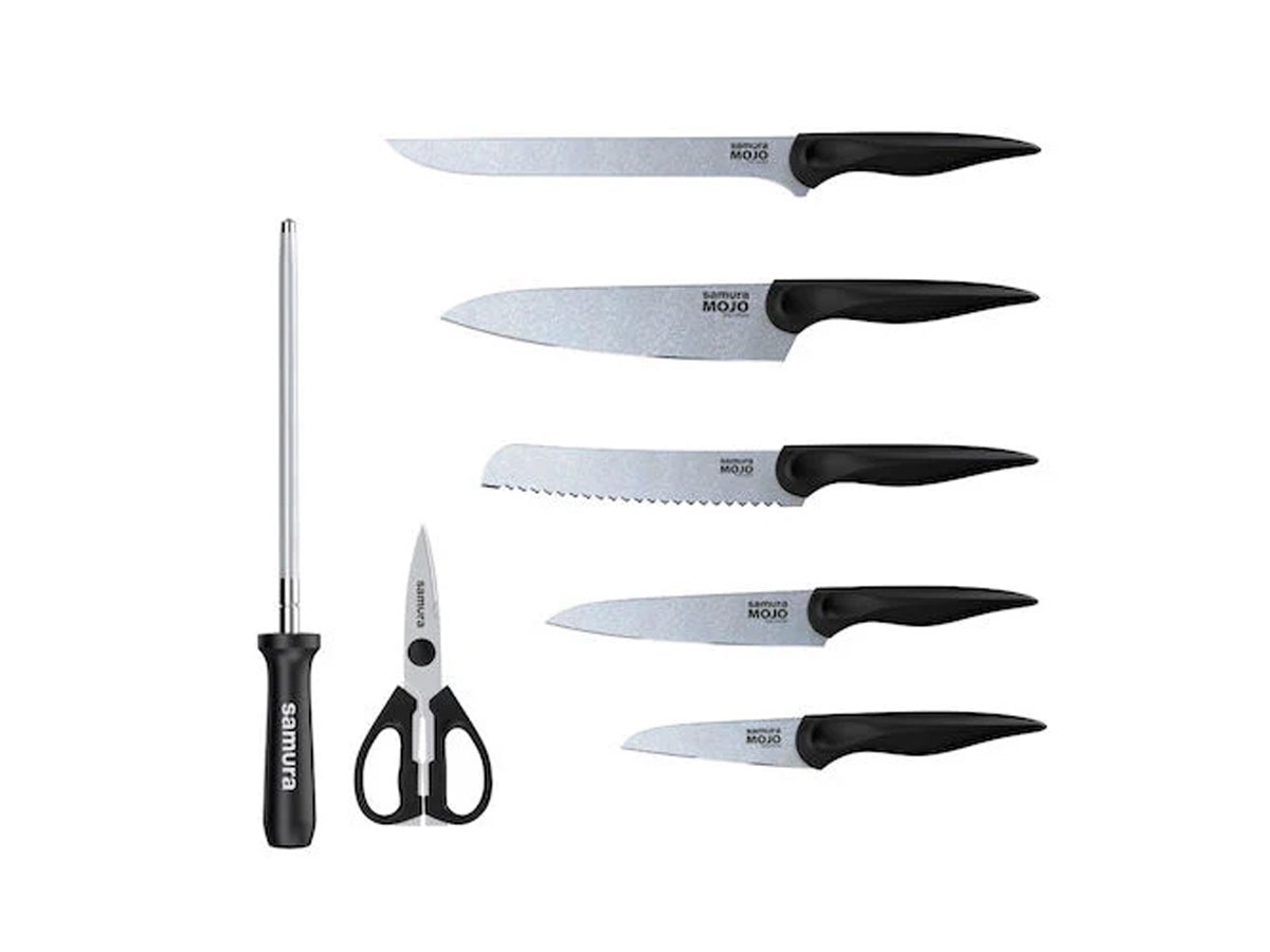 - 1 x Cuoco cm 20- 1 x Filettare cm 14,8- 1 x Filetto cm 21,8- 1 x Pane cm 19,4- 1 x Spelucchino cm 9,4- 1 x Acciarino - 1 x Forbici - 1 x Portacoltelli in legno