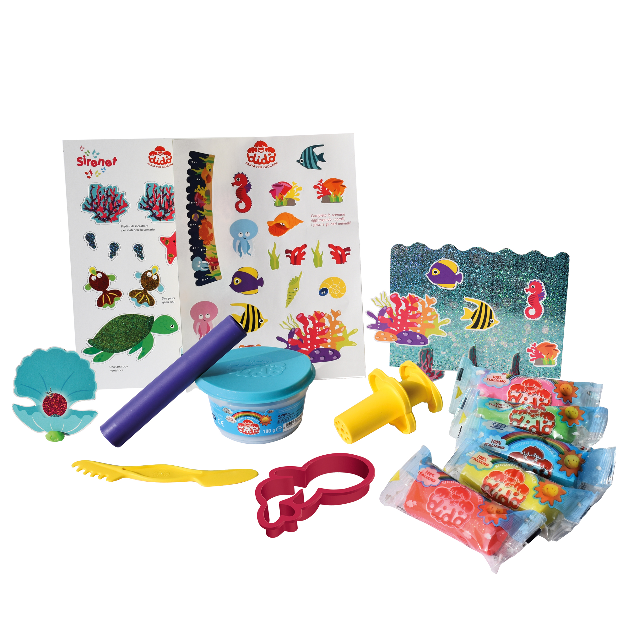 SET COMPOSTO DA: 7 SALSICCIOTTI GLITTER, 1 FORMINA SIRENA, TRAFILA, STICKERS, SCENARIO GIOCO, GUIDA E ACCESSORI.