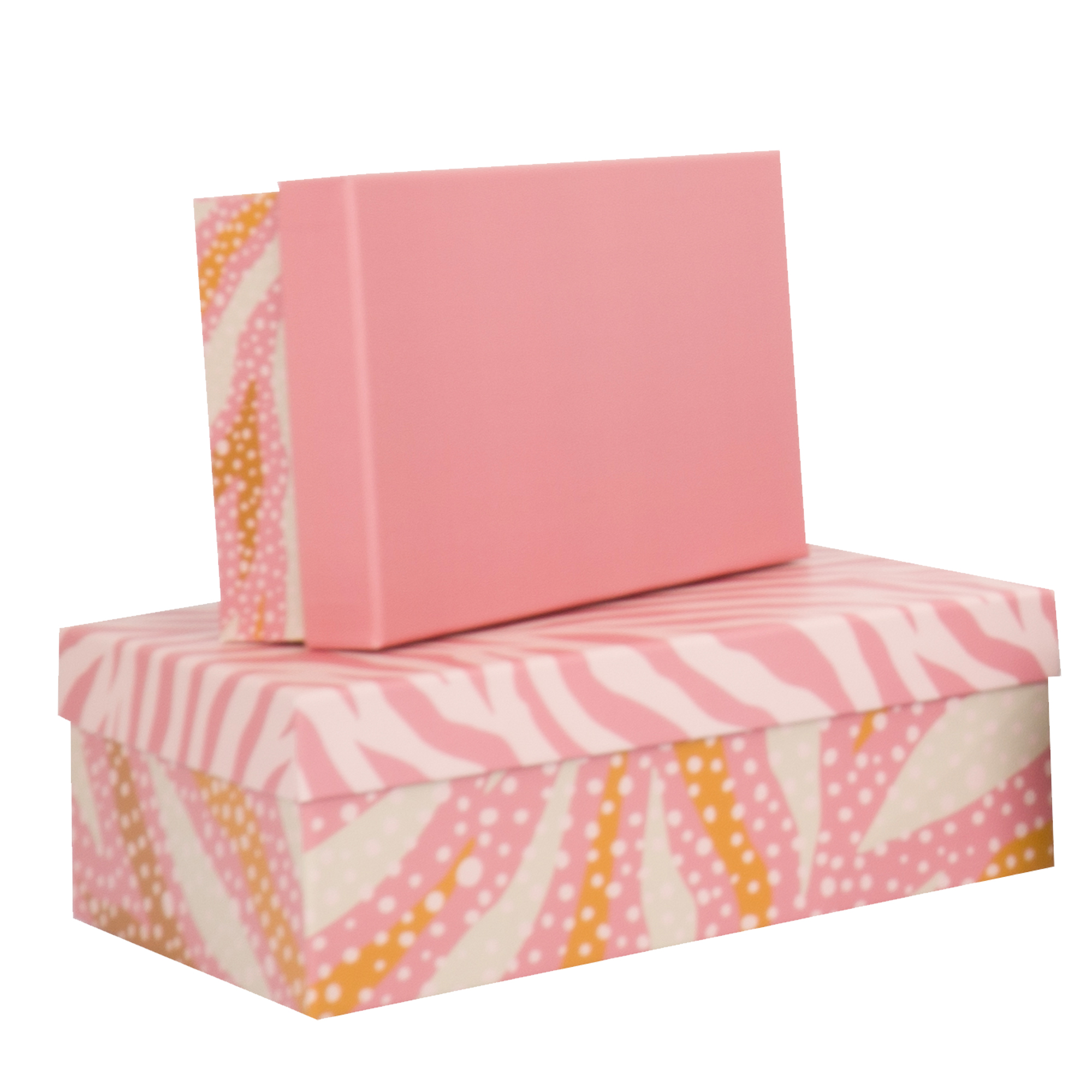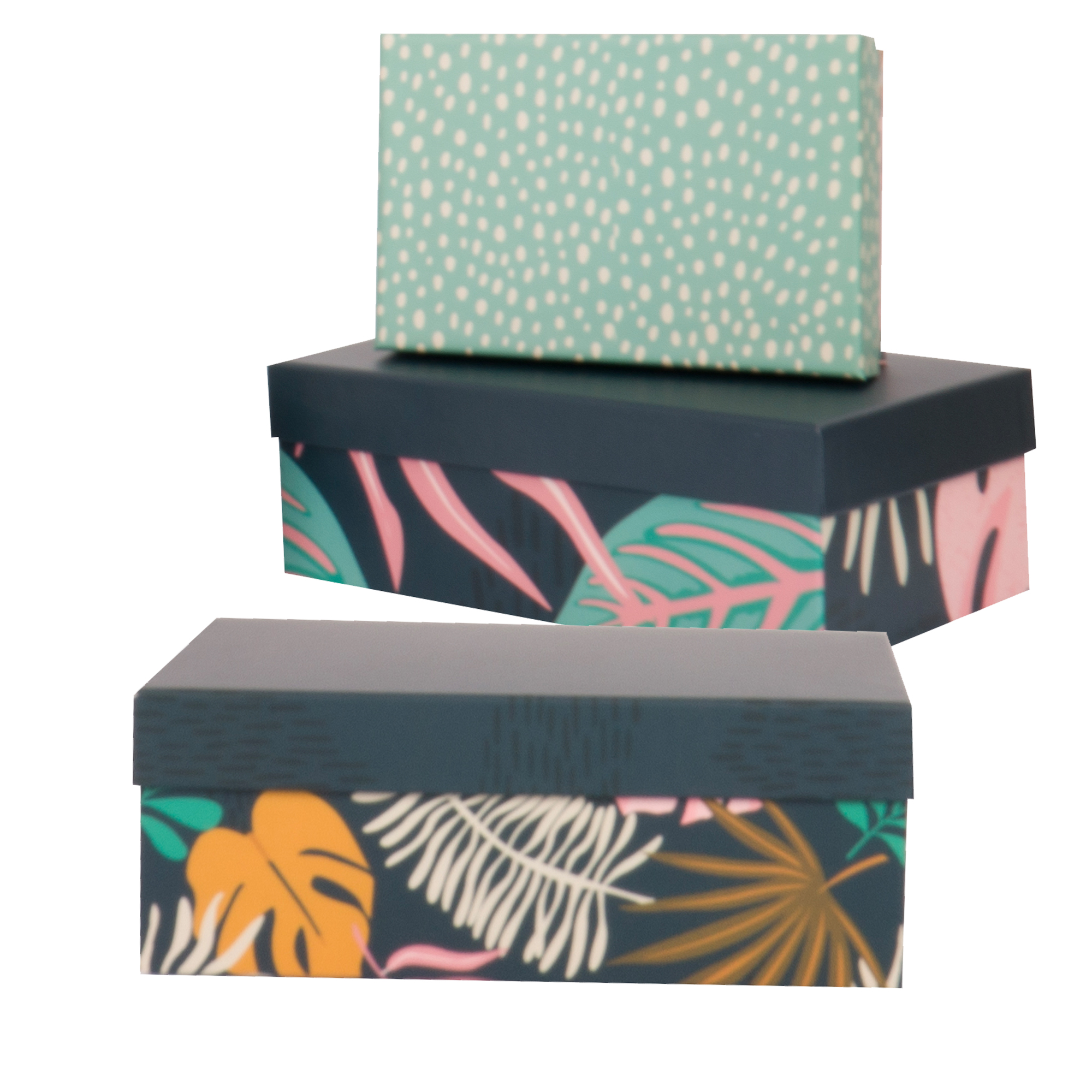 ROBUSTE E COLORATE SCATOLE IN CARTONE SPESSORE 2MM. RIVESTITE IN CARTA DA 170GR/M2 STAMPATA IN OFFSET E INCOLLATA A CALDO. IL SET E' COMPOSTO DA 5 SCATOLE, UNA PER OGNI MISURA: 14X21X6CM, 16X23X7CM, 17X24X8CM, 18,5X25X5X9CM, 20X27X10CM.
