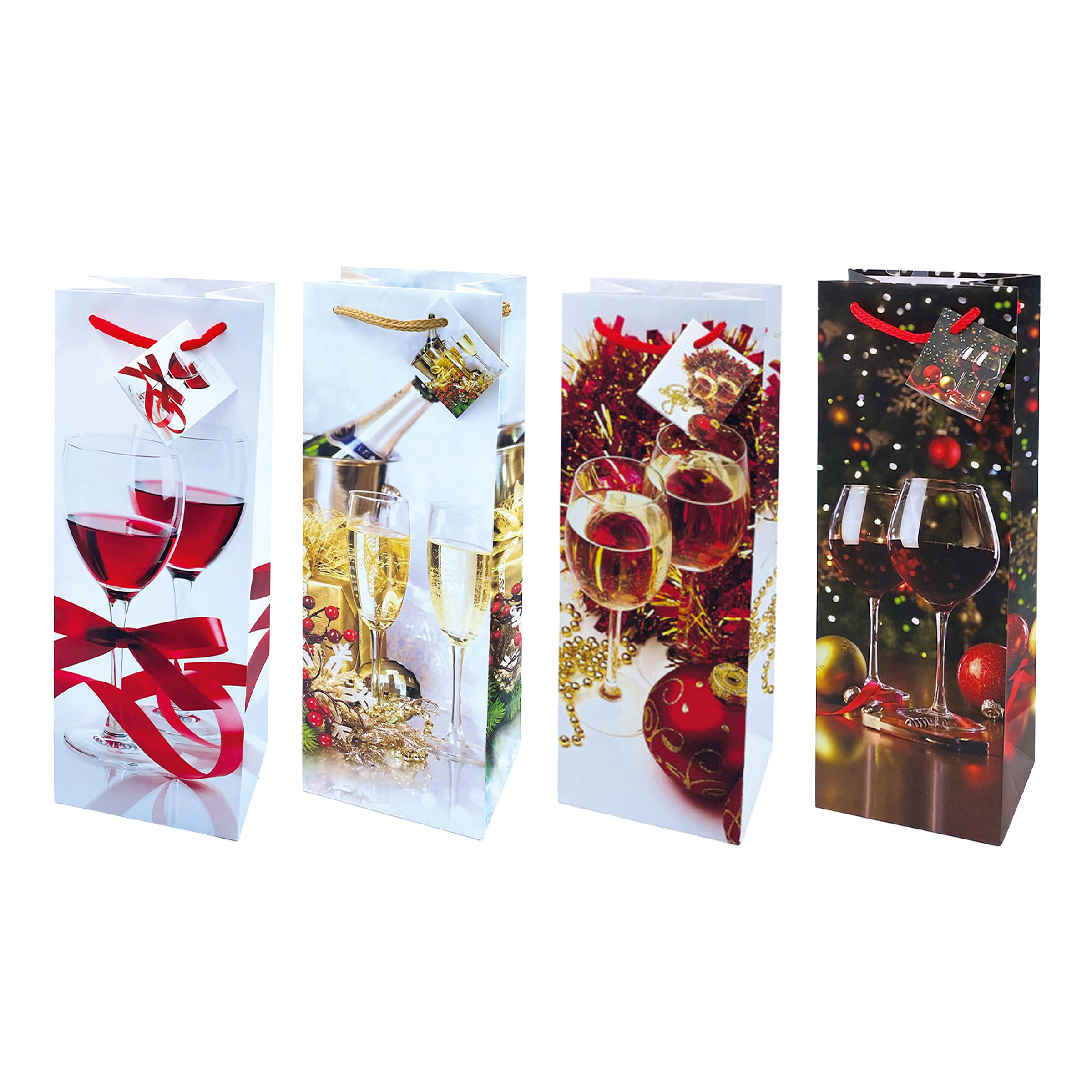 • Stampa a tema: Decorata con immagini natalizie ad alta definizione che includono calici, bottiglie, luci, decorazioni e atmosfere da festa, rendendo la confezione già pronta per essere regalata.