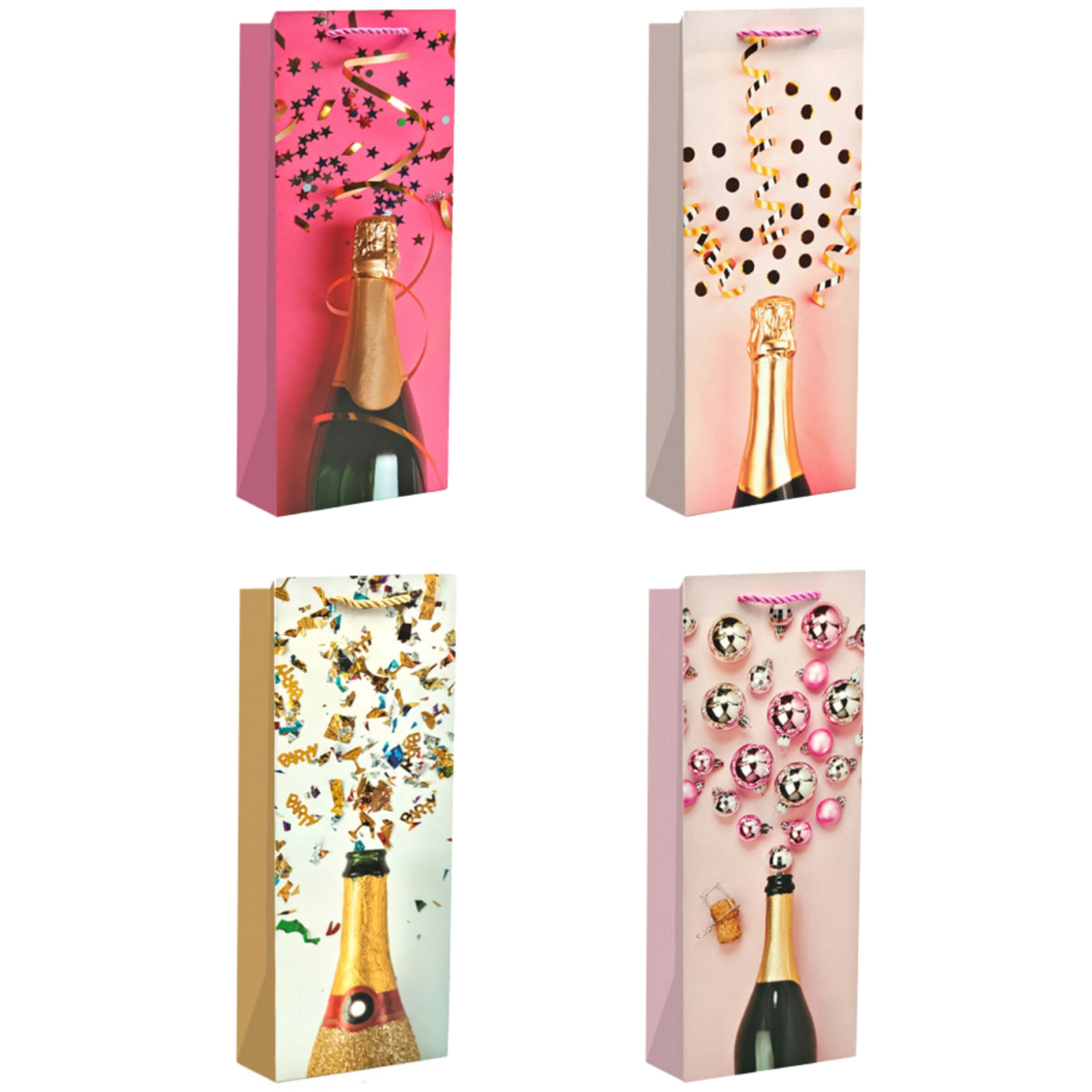 La shopper per bottiglia JB4186 della linea “Stappa la festa” è la confezione ideale per rendere ogni brindisi ancora più scenografico. Le grafiche esplosive, allegre e vivaci trasformano una semplice bottiglia in un simbolo di festa, allegria e condivisione. Perfetta per occasioni speciali come compleanni, anniversari, Capodanno o party a tema, è pensata per regalare emozioni fin dal primo sguardo.• Dimensioni ideali: Con misure di 12 x 9 x 35 cm, questa shopper è perfetta per bottiglie da 750 ml, garantendo una calzata precisa e una presentazione slanciata. La forma verticale è studiata per offrire stabilità e impatto visivo.• Design festoso e originale: Ogni shopper presenta stampe assortite con tappi che volano, coriandoli, stelle filanti e bollicine che escono da bottiglie di spumante. Le tonalità vivaci e le immagini realistiche trasmettono energia e gioia, perfette per celebrare ogni occasione.• Materiali resistenti: Realizzata in cartoncino rigido di alta qualità, è dotata di manici in cordoncino colorato abbinato. La base rinforzata assicura tenuta anche con bottiglie pesanti, senza compromettere l’eleganza.• Ideale per ogni festa: Questa shopper è perfetta per party privati, eventi aziendali, brindisi tra amici o confezioni regalo nei periodi festivi. Il suo stile dinamico e moderno conquista a colpo d’occhio, diventando parte integrante della sorpresa.• Pratica e ben esponibile: Dotata di gancio trasparente per essere facilmente appesa negli espositori da banco o a parete, migliora l’organizzazione nei punti vendita e attira l’attenzione del cliente in cerca di confezioni originali.La shopper per bottiglia JB4186 “Stappa la festa” è più di un semplice sacchetto regalo: è un invito a celebrare. La scelta giusta per chi vuole comunicare entusiasmo, cura del dettaglio e voglia di fare festa in grande stile.