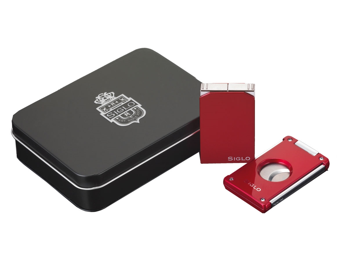 In risposta alle elevate richieste, SIGLO ha confezionato i suoi due accendini e taglierini più venduti in un set di accessori. Di grande pregio l'accendino Twin Flame, famoso per la sua doppia fiamma, jet e morbida, ed il tagliasigari Switch Blade, elegante e facile da usare. Il set è perfetto come regalo o per uso personale ed è ben confezionato in una scatola di latta nera. Quattro i colori disponibili: Rosso, Blu, Giallo e Nero.