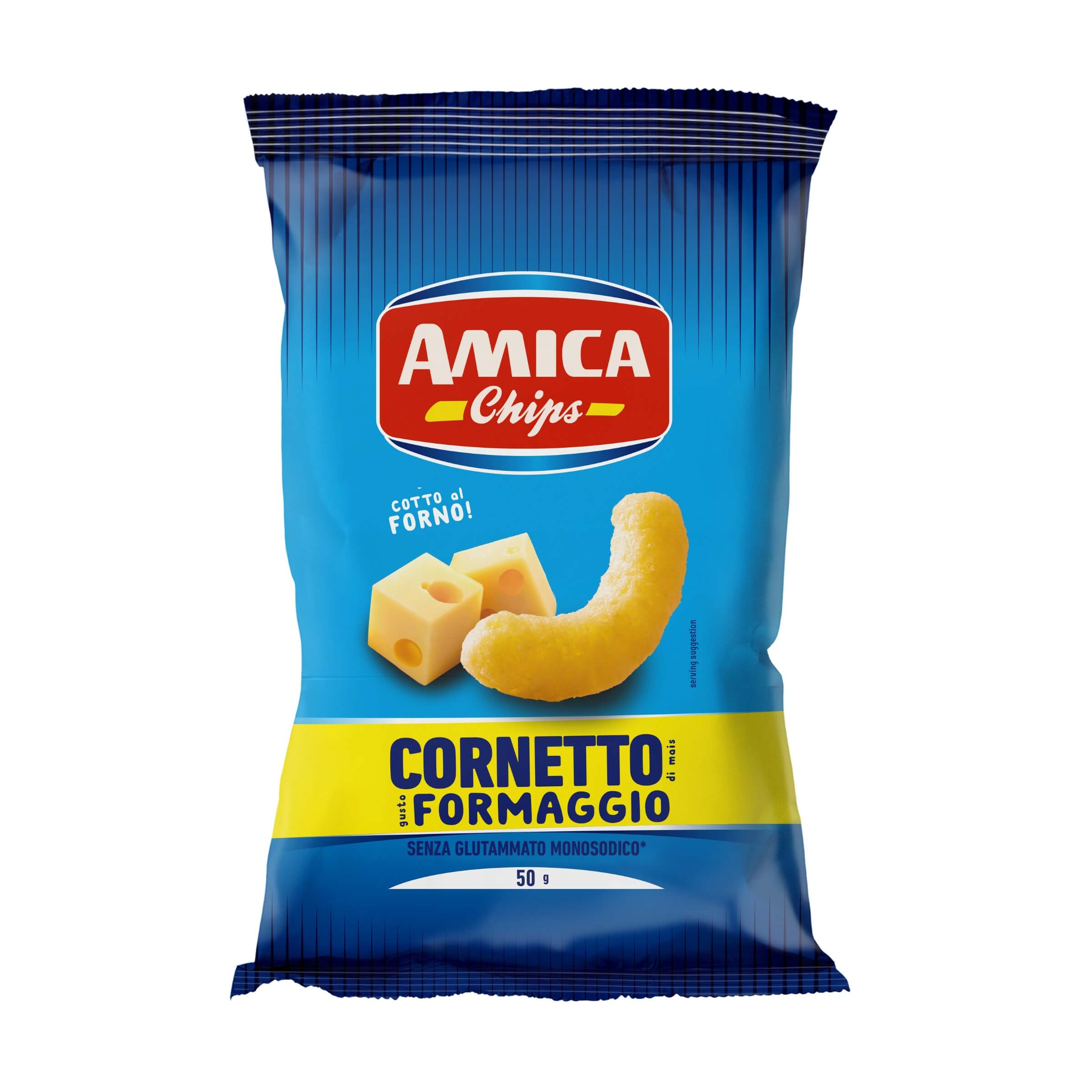 Gli Amica Snack Cornetto Formaggio sono deliziosi cornetti di mais, leggeri e croccanti, aromatizzati al formaggio. Questo snack è perfetto per chi cerca un piacere gustoso ma leggero, ideale per i bambini e per accompagnare feste di compleanno o semplici momenti di svago. La loro consistenza croccante e il sapore ricco di formaggio li rendono irresistibili.• Snack al Formaggio: I cornetti di mais aromatizzati al formaggio offrono un sapore intenso e irresistibile, adorato dai più piccoli ma apprezzato anche dagli adulti.• Leggeri e Croccanti: Perfetti per uno snack veloce, questi cornetti sono leggeri e dalla consistenza croccante, ideali per ogni momento della giornata.• Perfetti per le Feste: Gli Amica Snack Cornetto Formaggio sono il complemento perfetto per le feste di compleanno, amati dai bambini e ideali da condividere in compagnia.• Ingredienti: Farina di mais (64%), olio di girasole alto oleico, aromi contenenti formaggio e derivati del latte (11%), esaltatore di sapidità (glutammato monosodico). Può contenere tracce di cereali contenenti glutine e soia.• Valori Nutrizionali per 100 g:Calorie: 2129 kJ / 508 kcalGrassi: 25 g (di cui grassi saturi: 2,4 g)Carboidrati: 63 g (di cui zuccheri: 4 g)Fibre: 1,7 gProteine: 7 gSale: 2,4 gGli Amica Snack Cornetto Formaggio sono lo snack ideale per una pausa gustosa o per rendere più speciali le tue feste. Con la loro leggerezza e croccantezza, conquisteranno tutti con il loro delizioso sapore di formaggio.