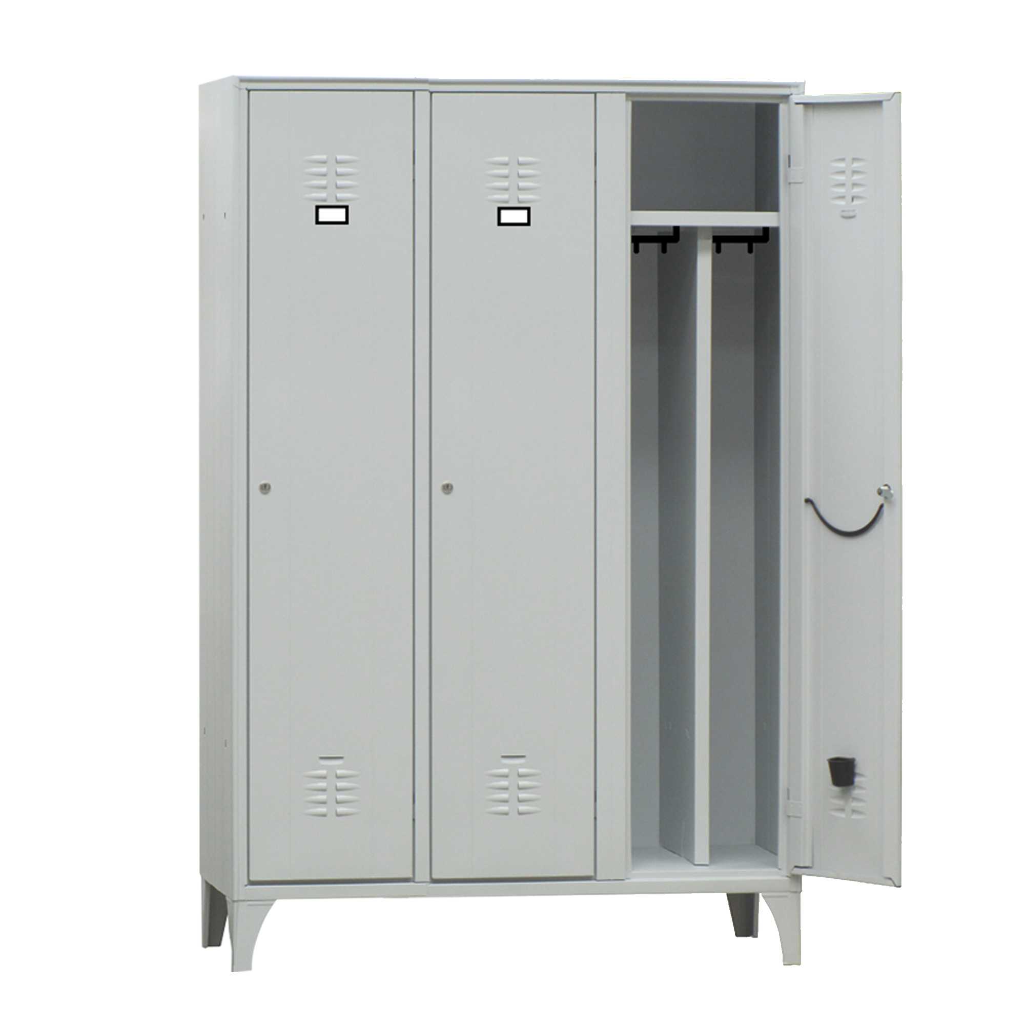 ARMADIO AD 3 VANI CON TRAMEZZA (PER SEPARAZIONE SPORCO/PULITO). OGNI VANO E' DOTATO DI RIPIANO SUPERIORE CON SOTTOSTANTE TUBO OVALE PORTA GRUCCE IN PVC COMPLETO DI GANCI SCORREVOLI. TRAMEZZA SPORCO / PULITO. PORTA OMBRELLO E VASCHETTA RACCOGLI GOCCE SU ANTA. PORTA CARTELLINO IN MATERIALE PLASTICO APPLICATO ALL’ANTA. CHIUSURA CON SERRATURA A CILINDRO CON DOPPIA CHIAVE IN DOTAZIONE. FORNITO MONTATO.