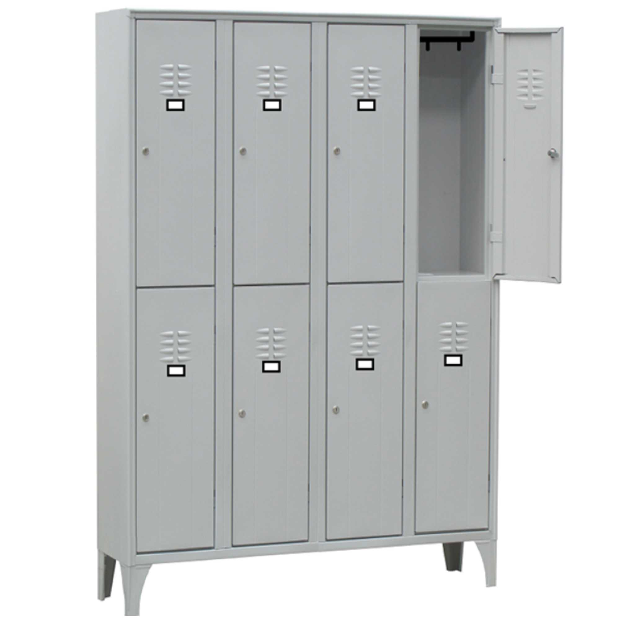 ARMADIO A 8 VANI SOVRAPPOSTI. OGNI VANO E' DOTATO DI TUBO OVALE PORTA GRUCCE IN PVC COMPLETO DI GANCI SCORREVOLI NON ESTRAIBILI. PORTA CARTELLINO IN MATERIALE PLASTICO APPLICATO ALL’ANTA. CHIUSURA CON SERRATURA A CILINDRO CON DOPPIA CHIAVE IN DOTAZIONE. FORNITO MONTATO.