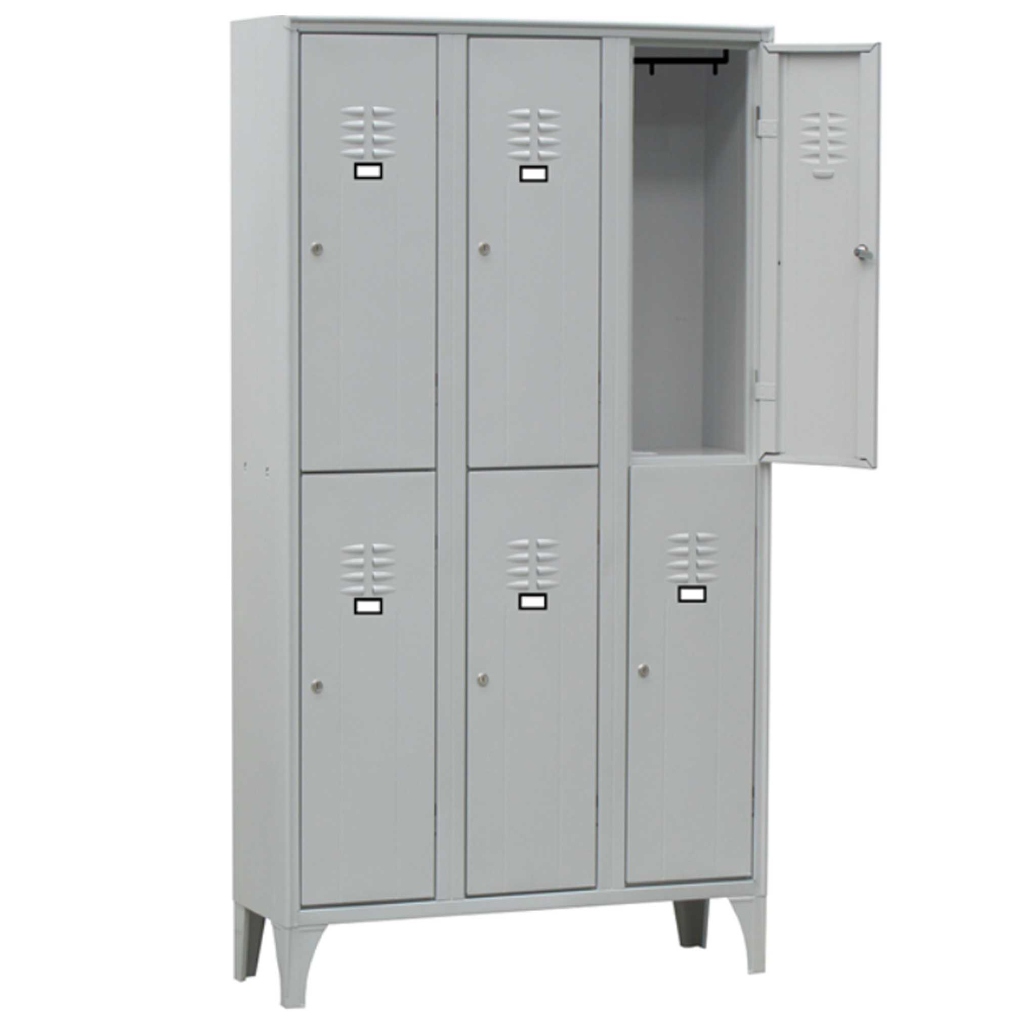 ARMADIO A 6 VANI SOVRAPPOSTI. OGNI VANO E' DOTATO DI TUBO OVALE PORTA GRUCCE IN PVC COMPLETO DI GANCI SCORREVOLI NON ESTRAIBILI. PORTA CARTELLINO IN MATERIALE PLASTICO APPLICATO ALL’ANTA. CHIUSURA CON SERRATURA A CILINDRO CON DOPPIA CHIAVE IN DOTAZIONE. FORNITO MONTATO.