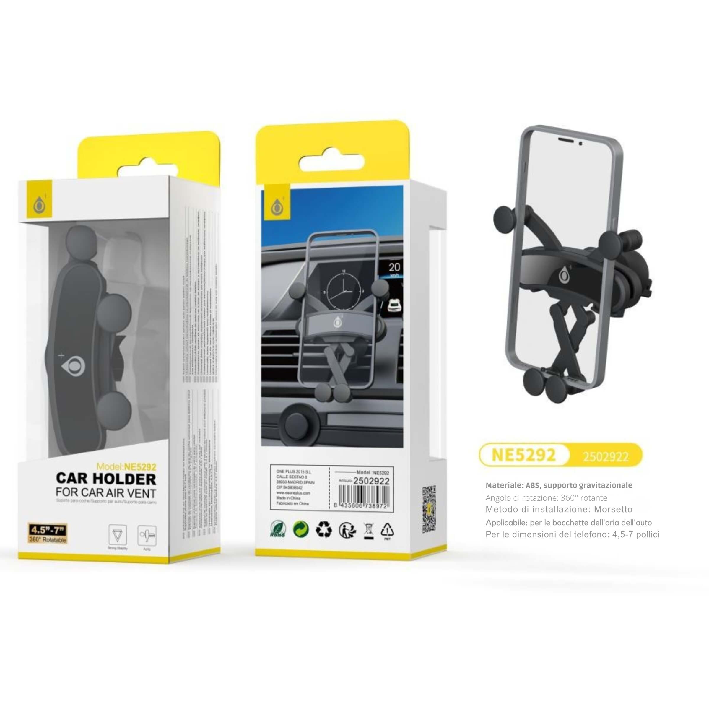 Un supporto per telefono in auto è un accessorio fondamentale per garantire sicurezza, comfort e praticità durante la guida. Il modello NE5292 è stato progettato per offrire una soluzione versatile e affidabile, pensata per adattarsi facilmente a diversi modelli di smartphone e a tutte le tipologie di veicoli con bocchette di aerazione standard. La sua struttura a gravità, combinata con un design moderno e compatto, assicura un utilizzo semplice e intuitivo, mantenendo il telefono ben saldo anche durante i percorsi più impegnativi. Grazie alla possibilità di rotazione a 360 gradi, consente di orientare lo schermo in verticale o in orizzontale con estrema facilità, rendendolo ideale per consultare mappe, rispondere a chiamate in vivavoce o ascoltare musica in totale comodità.• Sistema a gravità: il telefono si blocca automaticamente non appena viene inserito nel supporto, grazie a un meccanismo intelligente che sfrutta il peso del dispositivo per garantire stabilità e sicurezza.• Compatibilità universale: progettato per smartphone con dimensioni comprese tra 4,5 e 7 pollici, copre la maggior parte dei modelli presenti sul mercato, dai più compatti ai dispositivi di ultima generazione con display ampi.• Rotazione a 360 gradi: la base regolabile permette di posizionare lo smartphone nella visuale preferita, sia verticale che orizzontale, garantendo la massima flessibilità di utilizzo.• Installazione semplice: il morsetto posteriore consente un fissaggio rapido alle bocchette di aerazione dell’auto, senza l’uso di strumenti o adesivi, mantenendo l’interno del veicolo pulito e ordinato.• Materiali resistenti: realizzato in ABS di alta qualità, offre robustezza e durata nel tempo, resistendo all’usura quotidiana e mantenendo intatte le sue caratteristiche anche con utilizzo frequente.• Stabilità ottimizzata: le estremità antiscivolo rivestite in gomma proteggono lo smartphone da graffi e ne migliorano l’aderenza, evitando oscillazioni o cadute anche in caso di frenate improvvise.Questo supporto universale per telefono non è soltanto un accessorio tecnico, ma un alleato quotidiano che unisce funzionalità e sicurezza, rendendo ogni viaggio più piacevole e organizzato. La sua praticità lo rende perfetto sia per chi utilizza lo smartphone come navigatore sia per chi desidera avere sempre a portata di mano le funzioni principali in totale comfort.