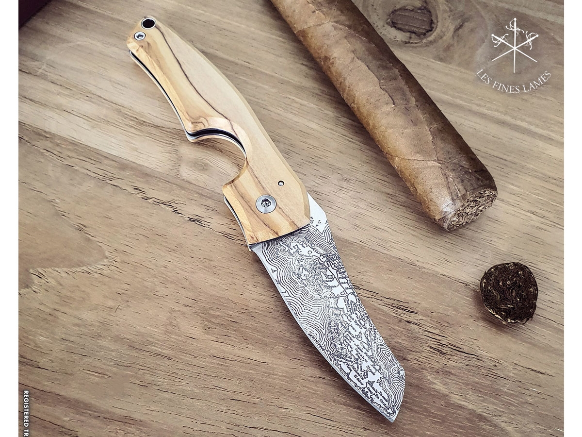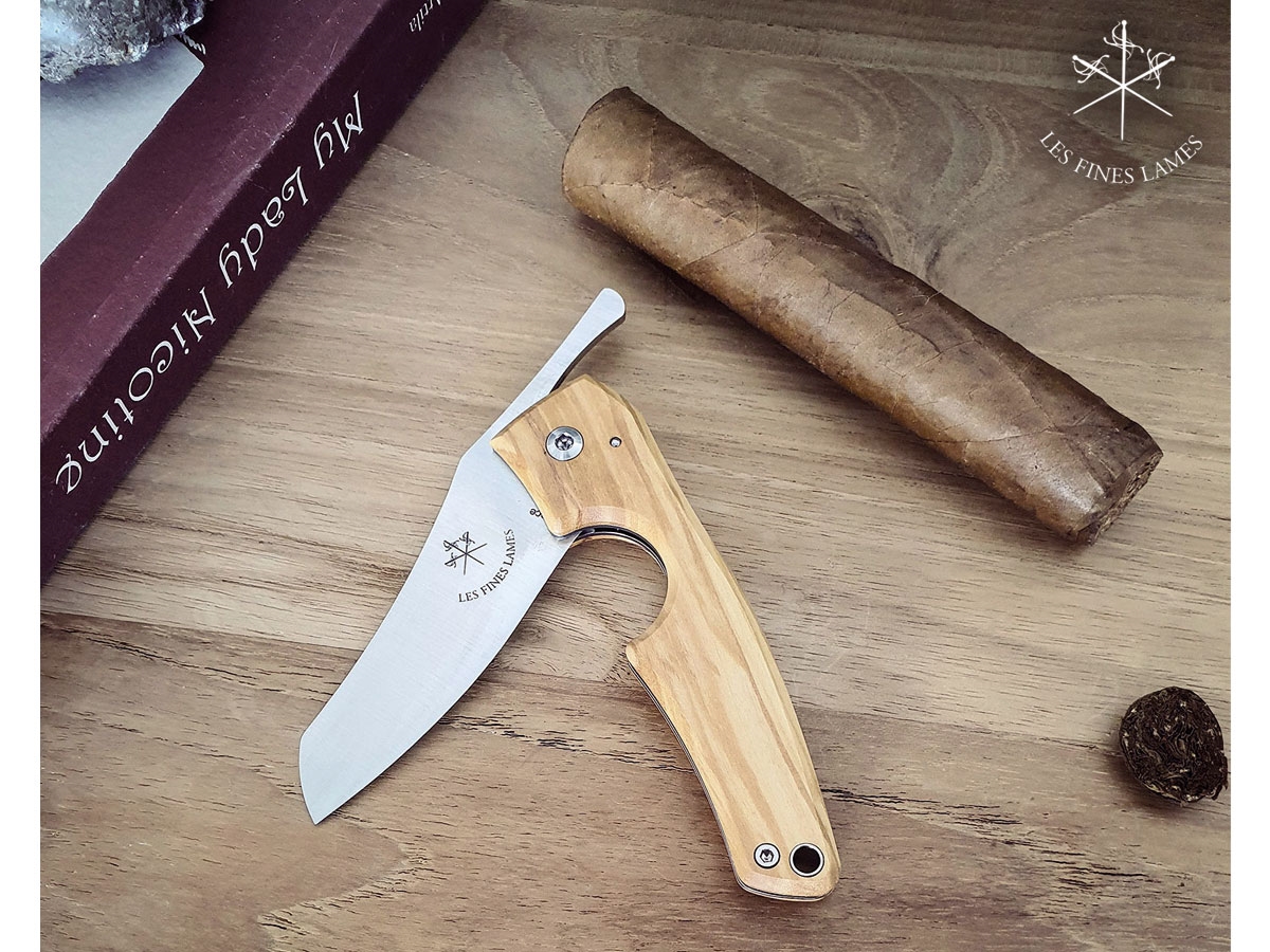 LE PETIT \"COMPASS-CUBA OLIVIER\" di LES FINES LAMES è un coltellino pieghevole tascabile multifunzionale, che può essere usato anche come un pratico tagliasigari che permette di ottenere tagli pulitissimi. Si apre facilmente con una mano grazie alla Lens, una leva in metallo situata nell\'estensione della lama, caratteristica tipica dei coltelli pieghevoli piemontesi. La sua apertura di 23 mm può tagliare a metà un sigaro da 58 RG e la testa di sigari fino a 70 RG.